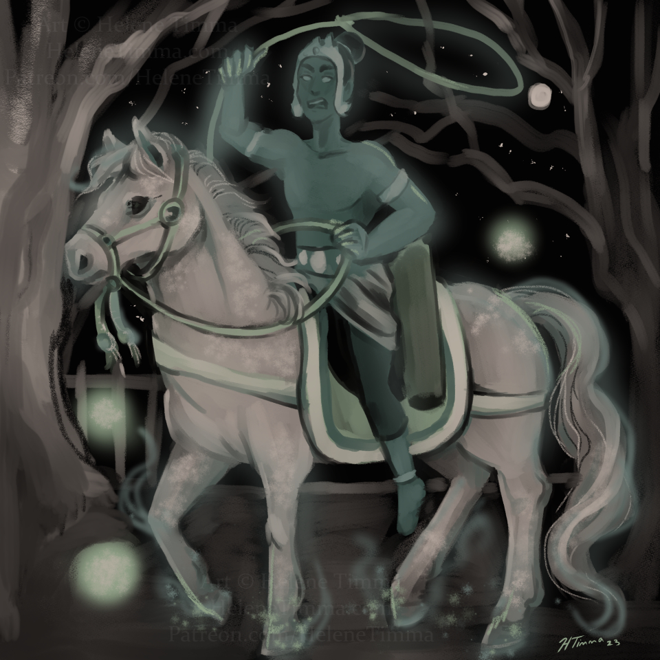 Mythic May Day 5, Paddengngeng. I had difficulty while finding sources for this one, but what I did find said that they were invisible horsemen who drag people through sickness and death. Learning about these different bits of folklore has been really interesting and different.