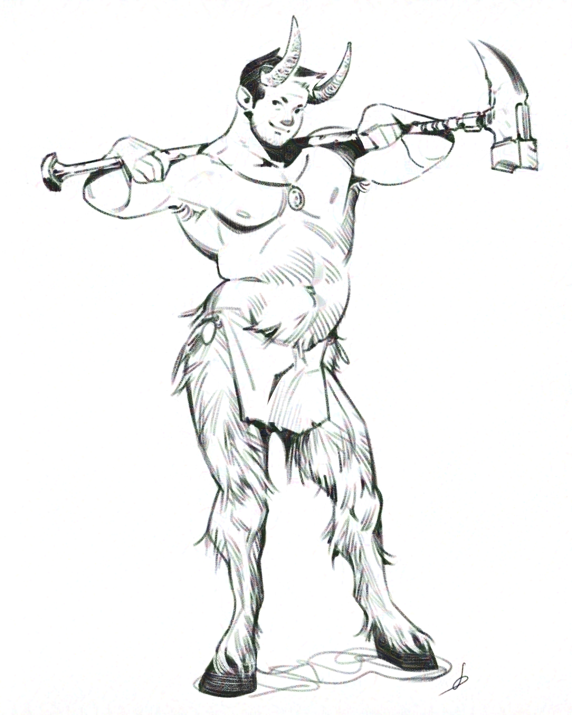The holidays was the perfect time to pick up Skyrim and hours of adventuring later, I know I gotta draw my guy. Here's satyr Caine, I'm liking his alt look quite a bit! :> Many thanks to the mod authors who made this possible: [Goat Legs](https://www.nexusmods.com/skyrimspecialedition/mods/72065) by Cthorthu and [Horns Helmets And Masks](https://www.nexusmods.com/skyrimspecialedition/mods/63043) by BaerGamer