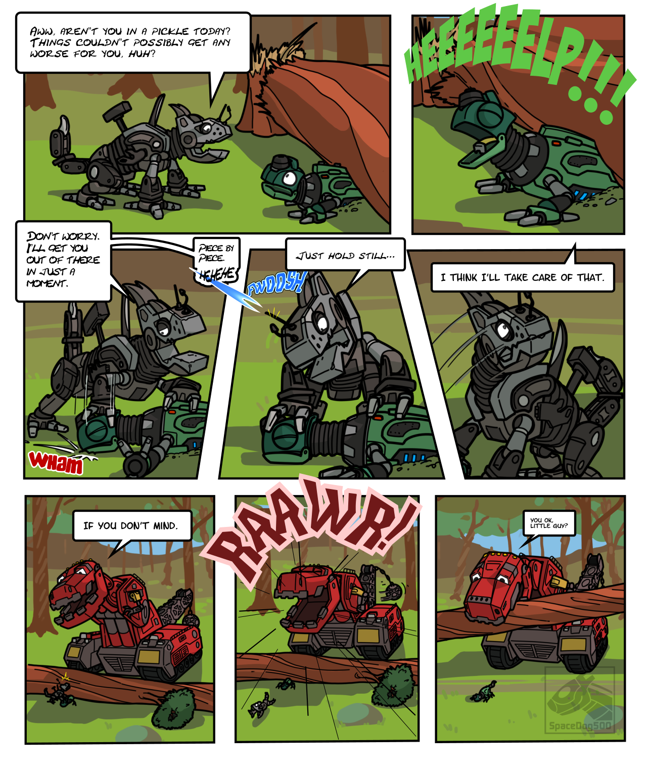 I bought a new vector based graphic program that lets me do cool stuff with text, like the Help scream and Rawr. So I thought I do a little Dinotrux comic.