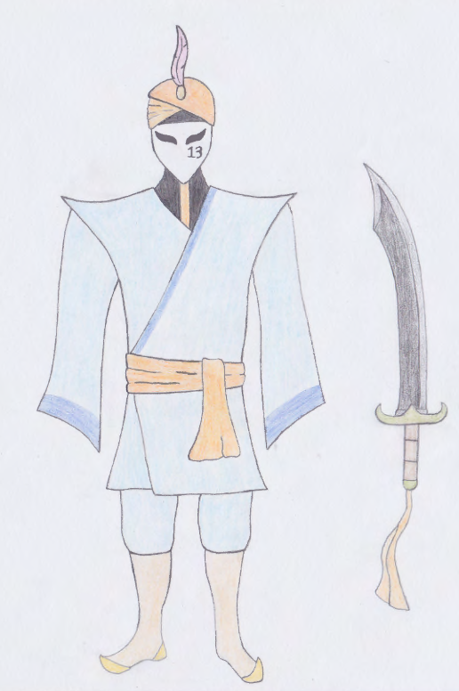 13 is a mute, possibly inhuman assassin in a fantasy setting who has an affinity for stylish outfits and masks, every inch of his body is covered and he dose not like it when his garments gets damaged.
