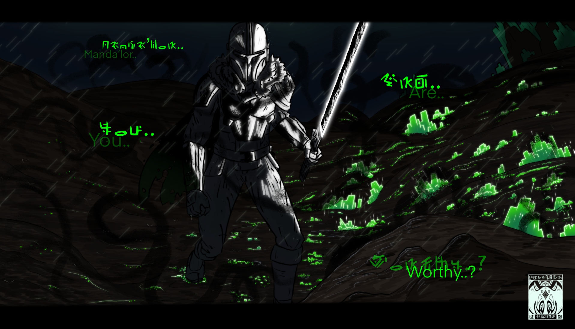 _**“Manda’lor…”**_,The raspy voice spoke as the black smoke moved unnaturally. It begins to surround the silver Mandalorian as he ignites the saber. The blade itself looked as if it will go out. The light begins to slightly flicker as the rain starts to pour.