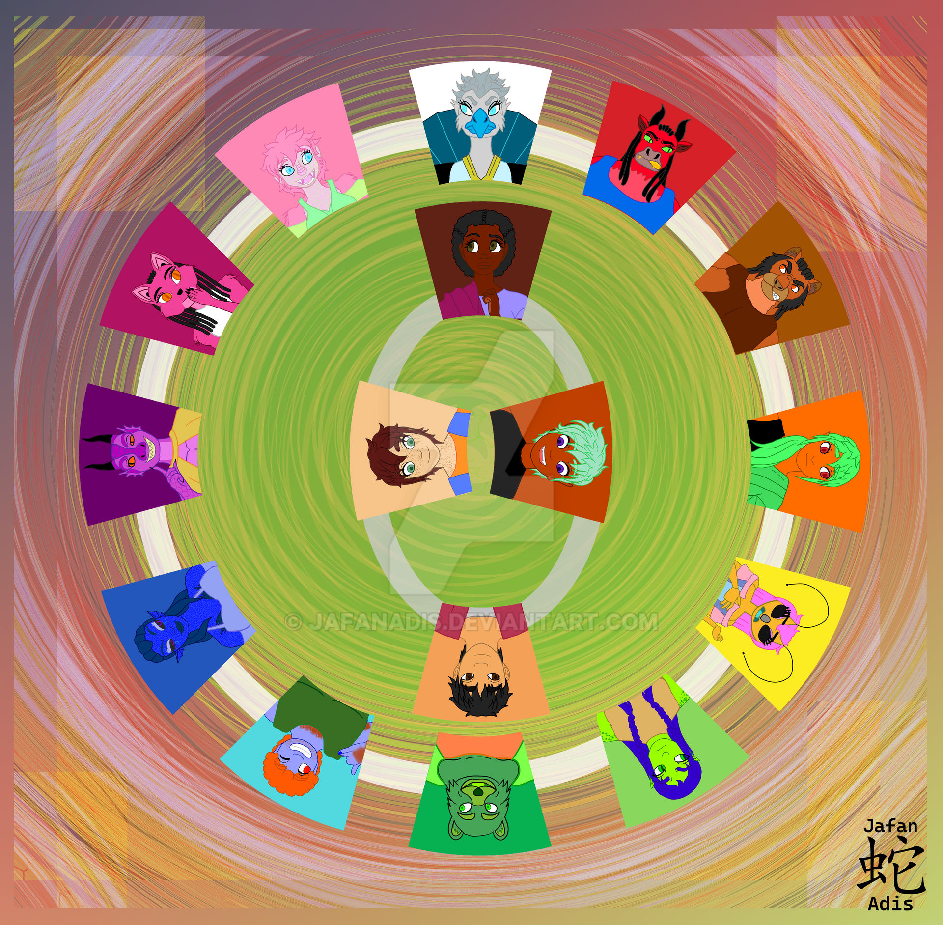 It is finally finished! Here is my Color Wheel Challenge. Featuring The Jade Owls. My children in all their rainbow splendor. Inner Circle Manhattan - Russell - The Passionate Poet Cocoa - Ash - The Loving Thief Russet - Zia - The Loyal Friend Apricot - Derrick - The Supportive Teacher Outer Circle Red - Itzapa - The Angry Gladiatrix Caramel - Haerile - The Disgraced Officer Orange - Chatan - The Kind Chef Yellow - Miri - The Annoying Businesswoman Pear - Kasai - The Runaway Slave Green - Rahkar - The Happy Mechanic Cyan - Lellain - The Crazy Gunner Blue - Qishya - The Seductive Temptress Purple - Jheron - The Shameless Filanderer Fuschia - Suri - The Anarchist Pilot Pink - Tai - The Rambunctious Prankster White - Vai - The Uppity Scientist The Jade Owls, Otacaia © Jafan Adis, 2022-2023. All Rights Reserved.