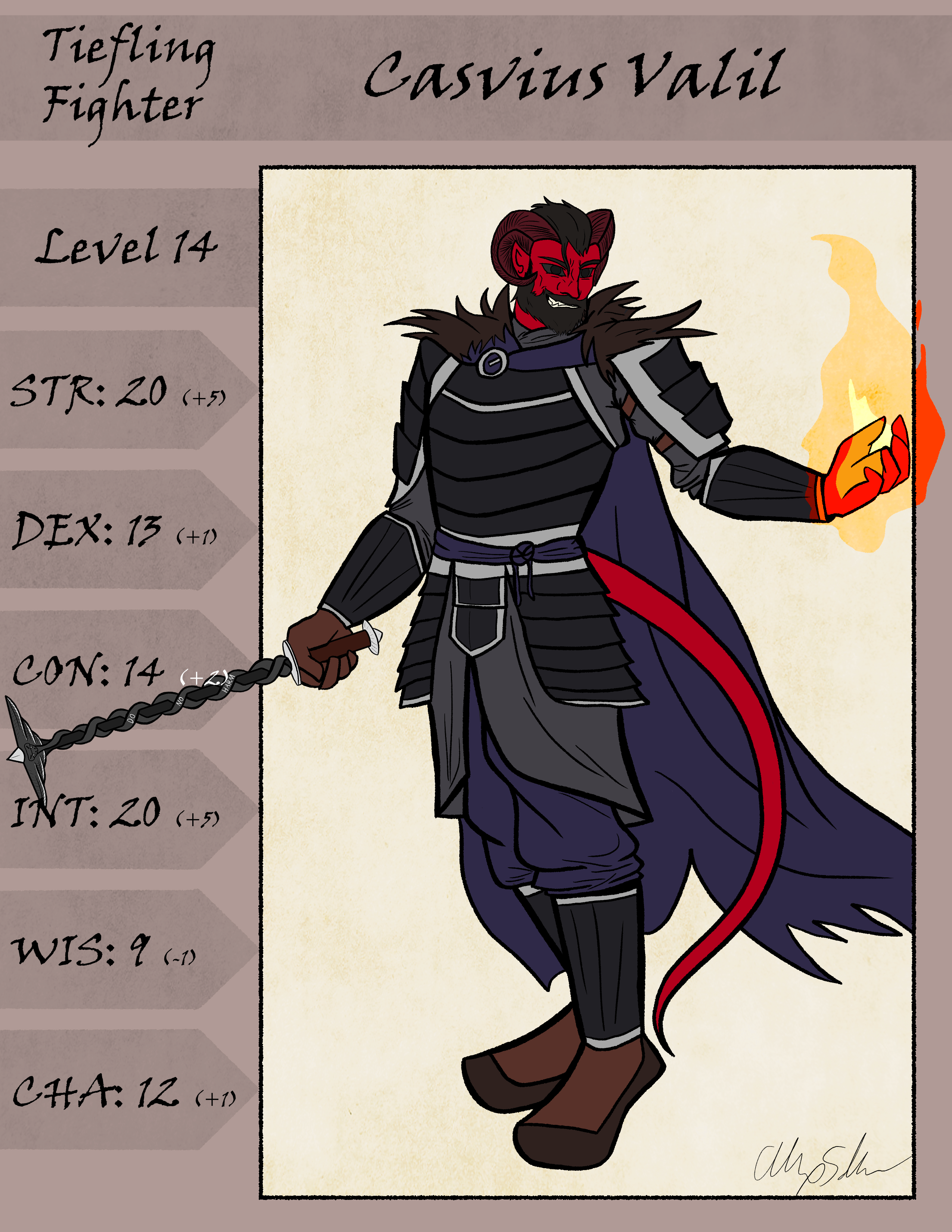 I've been running a Dungeons and Dragons 5e campaign for like... man, a long-ass time now. We started in 2018, if memory serves, and after all this time, I figure it's high-time I actually draw my friends' characters. Casvius left home at a young age to explore the wilds, offering his services as a sellsword and a self-taught mage to towns on the outskirts of civilization. Now a bounty hunter of modest repute, Cas took what was supposed to be an easy job, and has found himself as one of the last bastions of hope standing between civilization as we know it and oblivion. This was another fun armor set to work on. Cas bought it while the party was traveling abroad, so we discussed how it would differ aesthetically from armor made back in the main area of the campaign. Cas's player and I decided to give his armor a feudal Japanese-influenced design (in-game, it's made by the half-giant Goliath people). His mace was fun to work on too. It was a gift from a Cleric npc with a dry, morbid sense of humor; it's designed to resemble the Caduceus symbol, and inscribed with the Hippocratic Oath doctors take ("Above all else, do no harm"). I wanted to take this as an opportunity to test the waters for a new kind of reference sheet I want to offer specifically for RPG characters. The idea here is that there is a separate drawing of the character just in like, underwear or something, and the armor and accessories are all separate layers drawn over that base sketch. As a game goes on, a client who commissions one of these can come back for a follow up commission at a reduced rate to get new equipment and upgrades drawn over their original sketch.