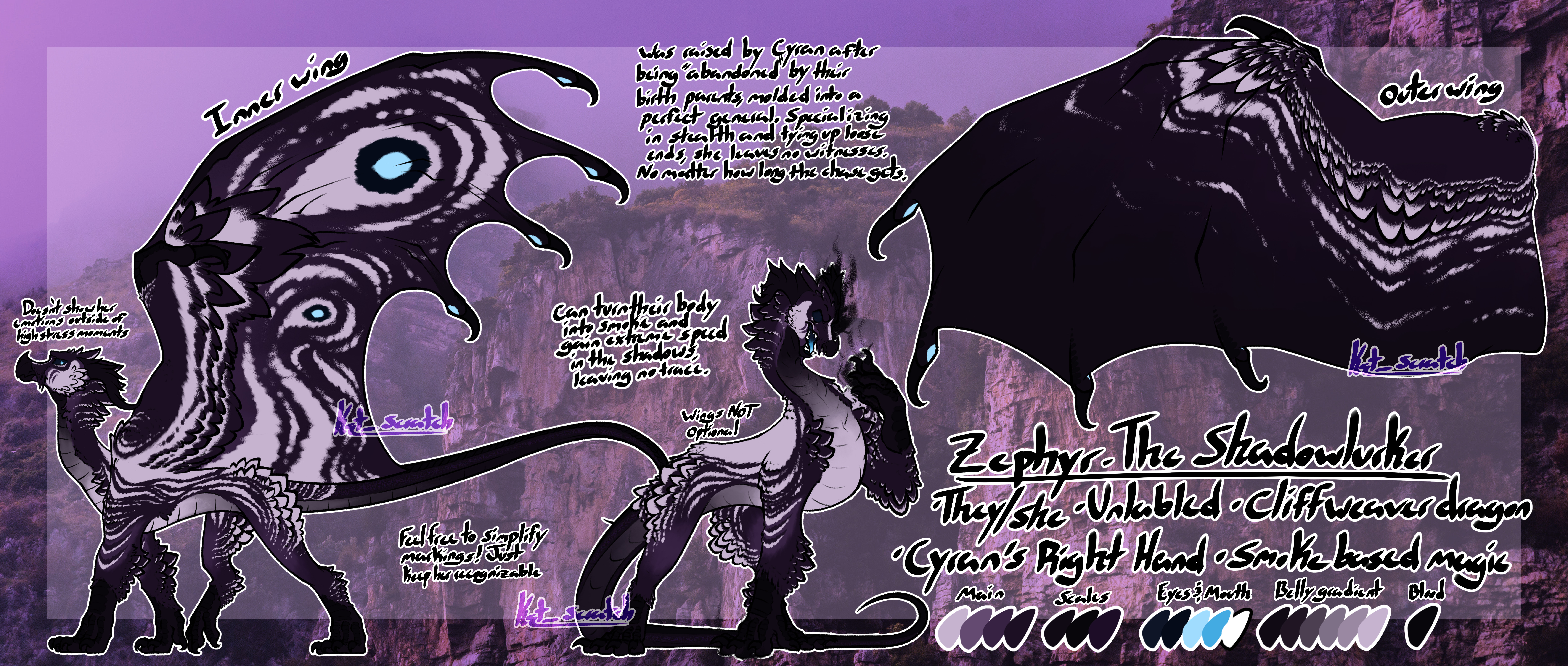 _A perfect general to the Abyssal Sun, an assassin with a near perfect kill record, the exact right hand that Cyran needed._ _Zephyr was abandoned at a young age, taken in by Cyran and raised to one day lead the Abyssal Sun. They weren't told much about their former family, only that they were ignorant to her potential, and threw her out like she was nothing. This led her to resent her former family and what they had supposedly done. Cyran was her family now, and so was the faction. They needed her more than her former family ever did._ _With the help of their transformation, Zephyr gained the ability to blend in with the shadows and traverse through them. Leading them to take on the task of tying up Cyran's loose ends and being given the title The Shadowlurker. Anything was on the table for them, making an example among recruits, killing off a former ally, or tracking down a supposed danger for the faction. Even other assassins themselves. No one was safe from their watchful glare._ ------ Last ref sheet for now, the rest of these catch-up posts will be actual pieces. ------ Zephyr's Toyhouse Page (Currently a WIP) - https://toyhou.se/18697987.zephyr