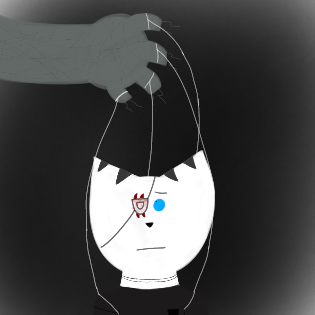 Image description: Drawing of Minea (white lombax) looking scared and above them is Ennard's hand who has strings in his fingers which are attached to Minea like a puppet