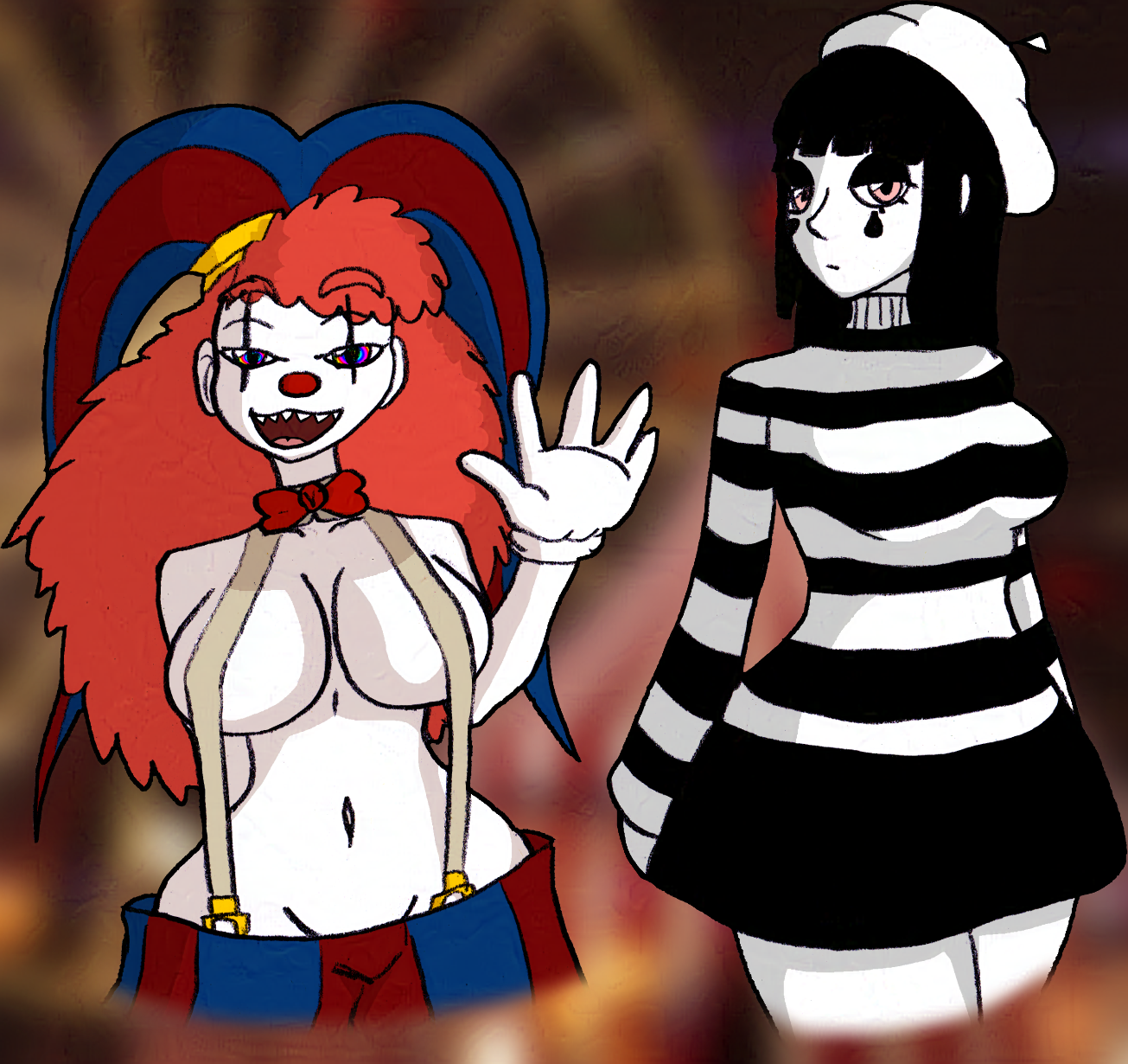 A pair of demon OCs! Paprika, the succubus clown, and her trans incubus gf, Suzy, the mime. Sorta nsfw due to Paprika's outfit I guess.