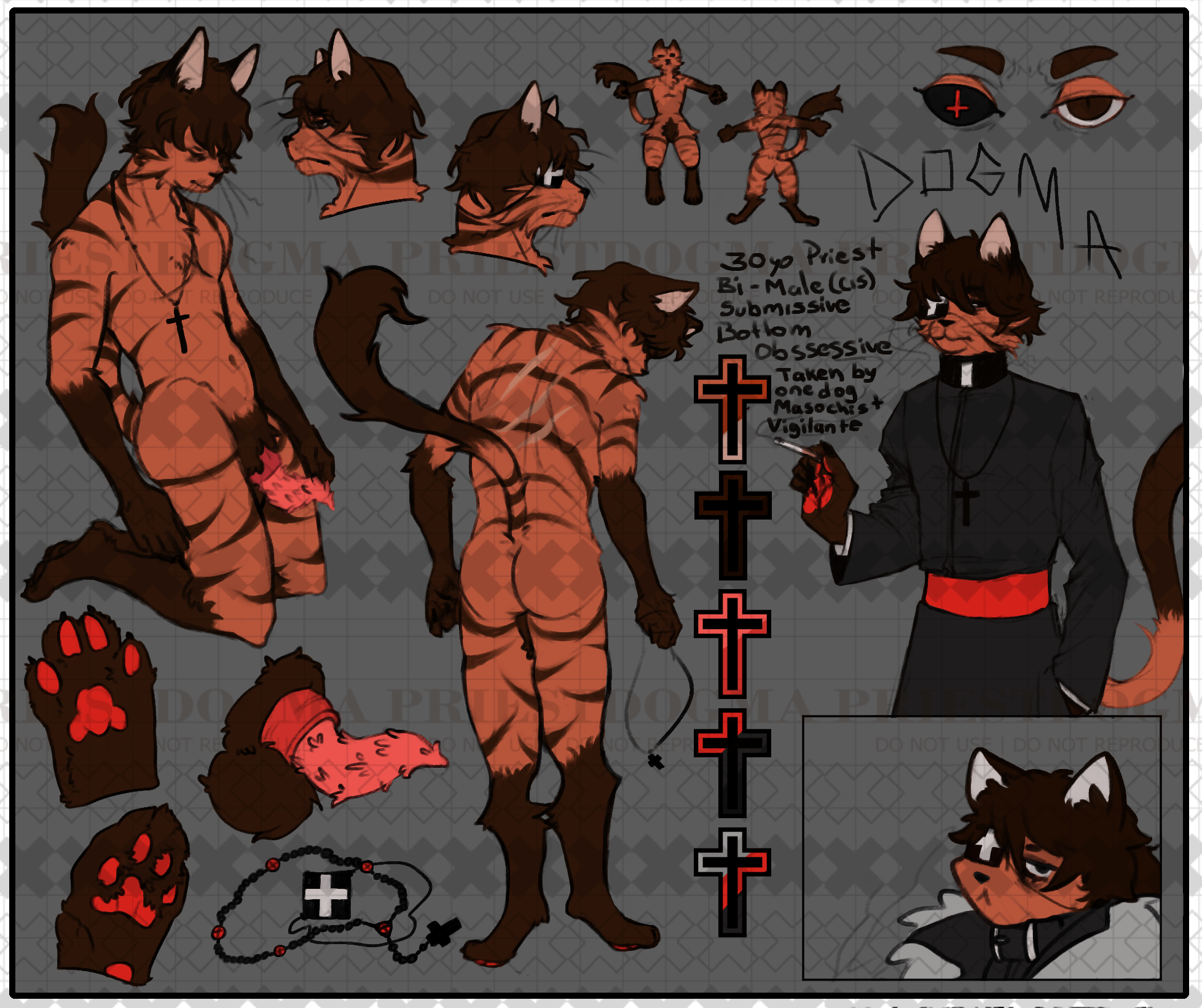 Dogma enjoys salty and spicy food, chicken and chocolate. He hates raisins and carrots. Resents being called 'orange' and despises having his paw pads pressed, although Catharsis does it all the time. Dogma also likes other cats, the sight of blood, and music. As well as a good novel and puzzles. He is not very expressive and struggles deeply with communication unless he is masking. He is asocial to a fault and carries himself through life as a fake and a charmer. Though he does not feel that way, about anything.This is Dogma, Catharsis's partner and pet. **The character belongs to me and is not free to use, draw, roleplay or anything like that. Fanart is appreciated but requires permission as I am very protective of these characters.** ----- * Age - 30 * Gender - Male * Sexuality - Bisexual * Occupation - Priest and Vigilante a la Moriarty * Relationship - Catharsis's pet and lover ----- Dogma is a priest with a troubled past and even shadier morals who enjoys a good cigarette after killing his local pedophile and getting his body destroyed by Catharsis. He lacks remorse and a sense of right and wrong, and thus depends on Catharsis heavily to decide on some things when it comes to morals. By word and profession a priest but by heart and inclination a mere murderer who enjoys the screams of his victims when they plea for mercy. He believes himself above the church and stops at nothing the second he finds a new victim. Lightly based on the protagonist of Priest (1994) with a twist- he does not tell on a pedophile, racist, abuser nor does he cover for them. He cuts them open like fish to avenge the victims of their abuse. His relationship to Catharsis cannot be boiled down to a mere romance as they are deeply involved in each other's affairs and he believes himself to be Catharsis's pet and puppet. He does the dog's dirty job without thinking about it and doesn't bother with asking questions when it comes to shedding blood or getting information that they want. He is deeply obsessed with Catharsis and relies on them heavily for most things as Dogma is partially blind and deeply traumatized, and he sees Catharsis as his sole source of comfort, love and stability. Catharsis is controlling and protective of him. Dogma enjoys salty and spicy food, chicken and chocolate. He hates raisins and carrots. Resents being called 'orange' and despises having his paw pads pressed, although Catharsis does it all the time. Dogma also likes other cats, the sight of blood, and music. As well as a good novel and puzzles. He is not very expressive and struggles deeply with communication unless he is masking. He is asocial to a fault and carries himself through life as a fake and a charmer. Though he does not feel that way, about anything.0 Comments 0 Shares 2 ViewsPlease log in to like, share and comment! -