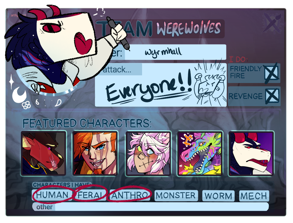 You can find me [here](https://artfight.net/~wyrmhall)! Card template can be found [here](https://twitter.com/theartfight/status/1672379057416318977?s=20)!YEEHAW, ARTFIGHT 2023 I'm going on Team Werewolf this year, and I am very excited :) You can find me [here](https://artfight.net/~wyrmhall)! Card template can be found [here](https://twitter.com/theartfight/status/1672379057416318977?s=20)!0 Comments 0 Shares 61 Views