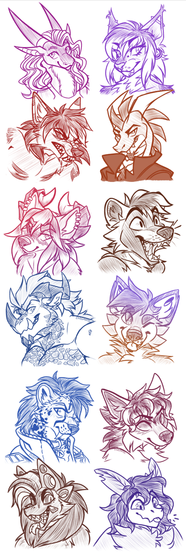 Some sketch busts as examples for my Sketch Bustshot commissions (to be added), I did for random people on twitter! These are made with a charcoal/pencil brush 1hr each, love all the colors and different characters. Thanks everyone!