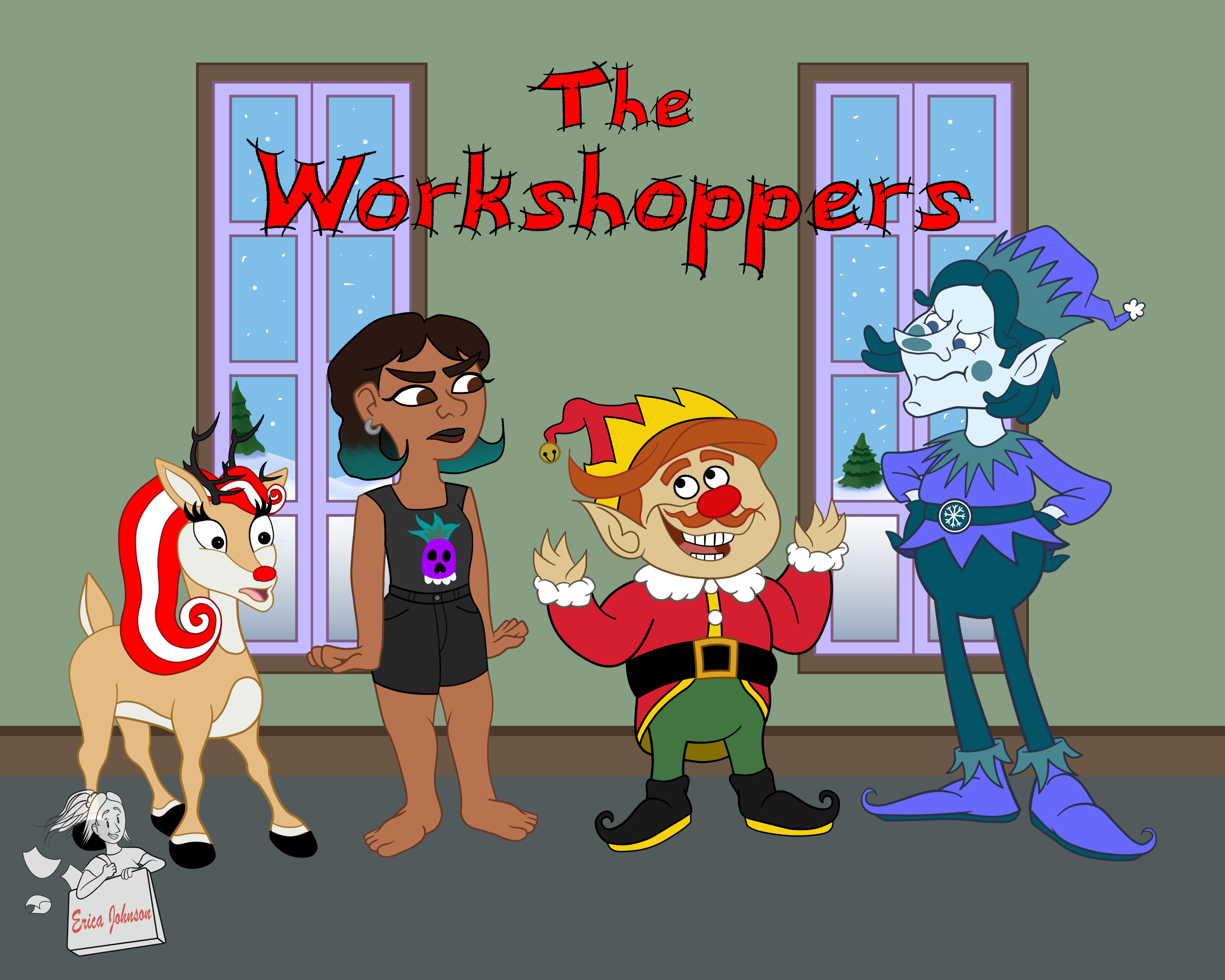 These are the four main characters of a what-if reality TV show about everyone who works at the North Pole going through daily tasks to prepare for the Holiday Christmas Season in The Workshoppers. Starring the hot-headed foreman, Burl Miser (middle right elf and not quite immortal hybrid) and the naughty list forced intern teen, Lani Ives (middle left). They are joined by this story's version of Jack Frost (right), Burl's popular immortal cousin, and the teen descendent of Rudolph the Red-Nose Reindeer, Davina (left). What could go wrong?! It's not The Office, Parks and Recreation, or any mockumentary you can name.