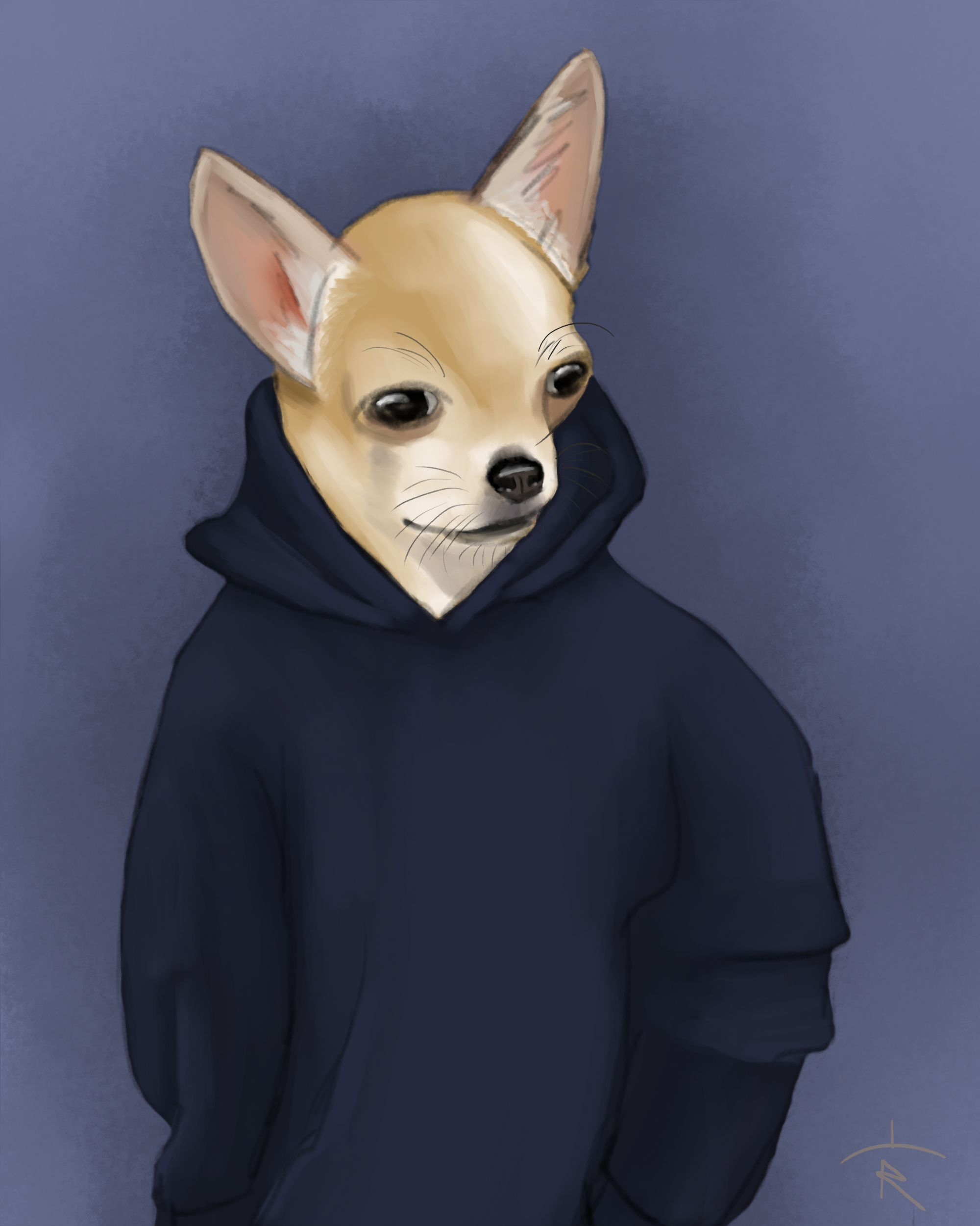 [ID: A digital painting of an anthropomorphic chihuahua dressed in a hoodie. The dog is looking at the viewer. /ID]Today's sketch, this little anklebiting bastard. Oh sure, he looks calm now, but he will 90000000000% go for an ankle if you piss him off lol. [ID: A digital painting of an anthropomorphic chihuahua dressed in a hoodie. The dog is looking at the viewer. /ID]0 Comments 0 Shares 107 Views -