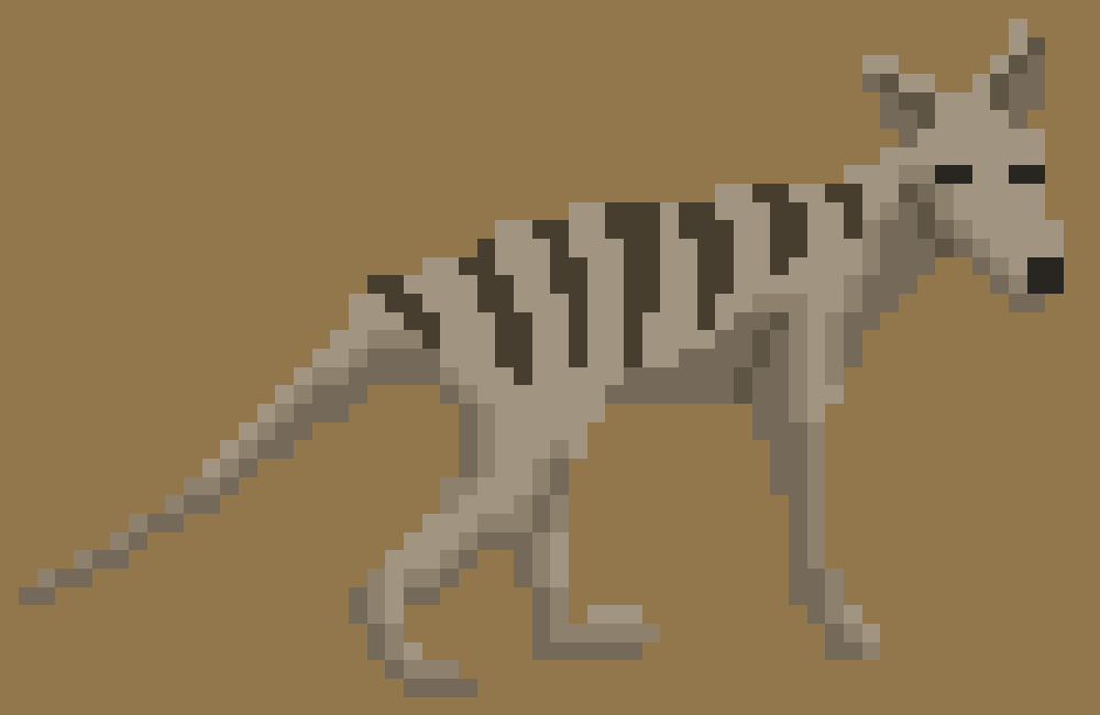 [ID: A pixel drawing of a thylacine against a light brown background. It's body is facing to the viewer's right and it's looking at the viewer with squinty eyes. /ID]Today's sketch, the humble thylacine. Sometimes I get super sad that these guys went extinct, and today I'm compensating for that by drawing one. Get one here: https://ko-fi.com/ormspryde/commissions [ID: A pixel drawing of a thylacine against a light brown background. It's body is facing to the viewer's right and it's looking at the viewer with squinty eyes. /ID]0 Comments 0 Shares 126 ViewsPlease log in to like, share and comment! -