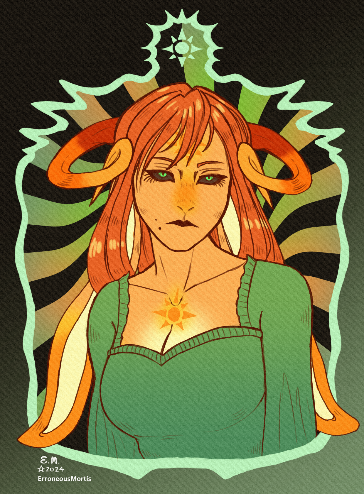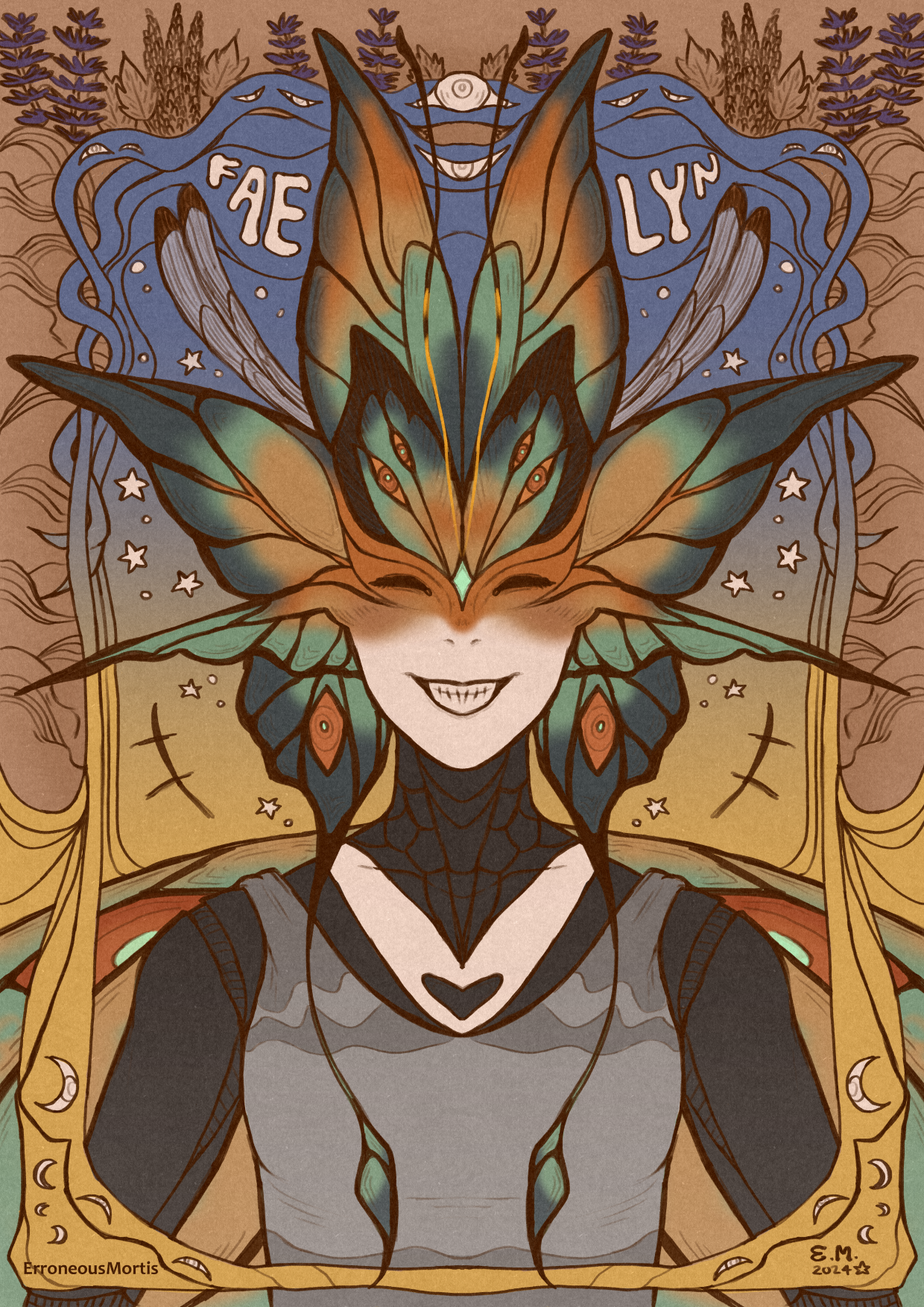 i channelled my love of vintage psychedelic rock band posters really hardcore into this one. i am always trying to pull from 60s/70s graphic design for the aesthetics in my art but i love it when i get inspired to delve fully into it like this! i felt as though the character's energy fit with it well, so i leaned into it. moth imagery, pretty colors, humans + nature mixing together, etc.