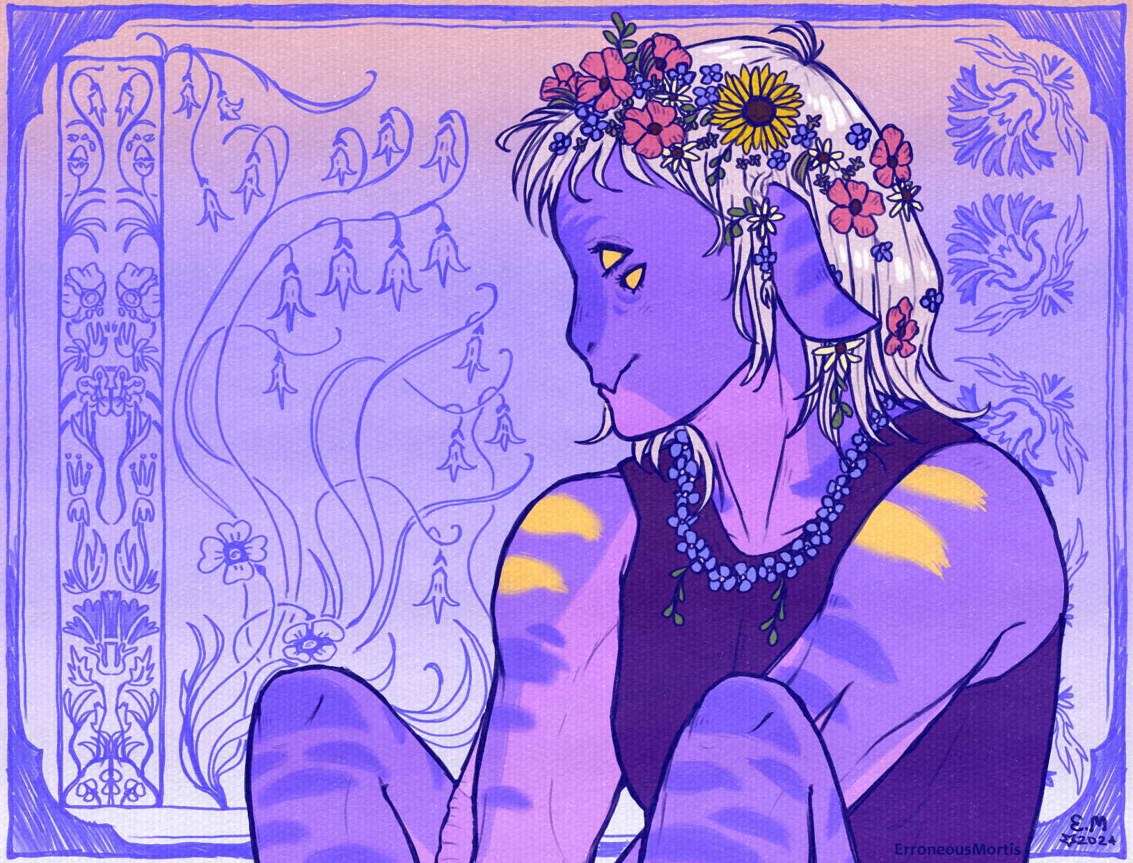 after three vertical portraits in a row, i wanted to do something different. for the design of this one, i referenced an art book that i had that contains a ton of art nouveau designs from the early 1900s :)