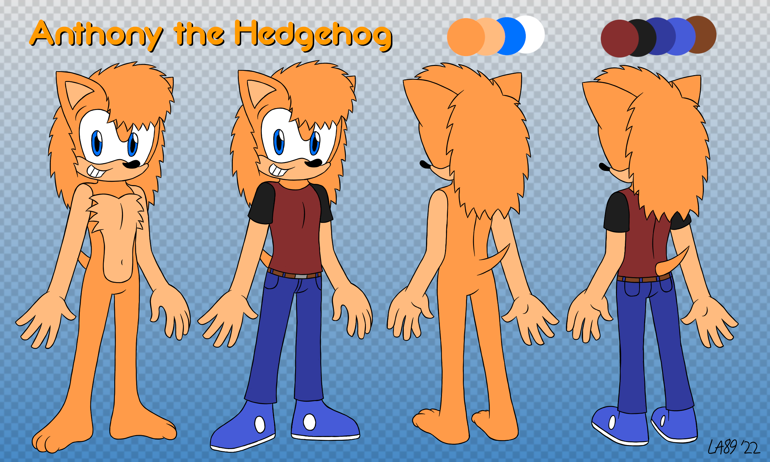 Weaknesses/Fears: Cold weather, bright lights, excessive eye contact, Deep water, heightsFull name: Anthony J. Perez Nicknames: Ant, Tony, Cheeto Age: 22 years old Height: 5' 10" Date of birth: October 21st Gender: Male Sexuality: Bisexual Species: Hedgehog Physical Appearance: Orange body fur, Orange hair, Orange tail, Peach muzzle, Peach chest fur, Peach arms, Blue eyes Preferred outfit: Purple shirt, Dark blue pants, Blue sneakers Alternate outfit: Black T-shirt, Red headband, Light blue jeans, Red boots, Black fingerless gloves Personality: He is usually very kind and funny, especially around his friends or his family. He also tends to be shy when meeting new people. At times, he is known to be emotional. He can be very bad tempered when someone gets on his bad side, or if he's under a lot of stress. When he is in love, he becomes very bashful, and in some cases, a little perverted. He is known for being intelligent, although he can be a little naive at times. He always tries to be there for his family, friends, and his love, and does the best he can to help them. Love Interest: Cassandra the Hedgehog Likes: Listening to music, playing music, playing video games, snack foods, soft drinks, relaxing, chatting with friends, cruising around town Dislikes: Being rushed, not knowing what to say, cold weather, loud noises, when people interrupt him, small spaces, crowded places Powers/Abilities: Although he doesn't have any special powers, he can be quick on his feet. He can also perform spin dashes at times. Weapon of Choice: Steel guitar Weaknesses/Fears: Cold weather, bright lights, excessive eye contact, Deep water, heights0 Comments 0 Shares 9 Views -