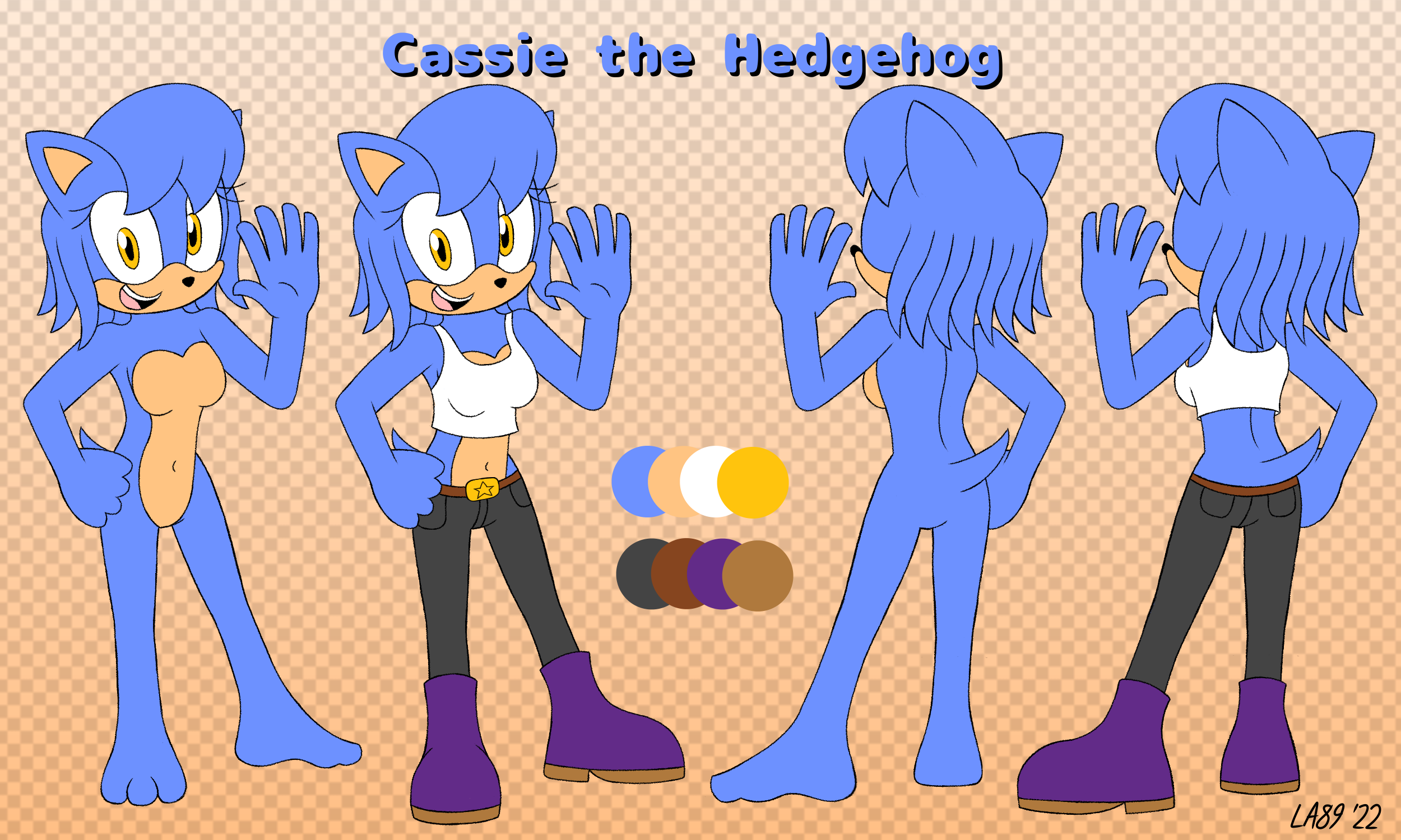 Weaknesses/Fears: Peppermint, spiders, weed whackers, her own bloodFull Name: Cassandra Marie Willson Nicknames: Cassie, Cass, Sandy Age: 20 years old (at the time of this post) Height: 6' 3" Date of Birth: February 10th Gender: Female Species: Hedgehog Sexual Orientation: Heterosexual Nationality: American Languages: English Occupation: Waitress Physical Appearance: Blue body fur and head fur, Peach muzzle and chest, Yellow eyes, Blue tail Preferred Outfit: White crop top, Dark gray pants with brown belt and yellow buckle, purple boots Alternate Outfit: Yellow dress, Tan sunhat, purple flip flops Sleepwear: Purple nightgown, red bra/panties Personality: She is mostly very sweet and caring, but she knows to be tough when she wants to. She is prone to lose her temper very easily, and tends to be depressed whenever she gets bored. When she is in love, she likes to act very cute and flirty. Love Interest: Anthony the Hedgehog Likes: Lifting weights, swimming, baking, sleeping, long showers, singing, dancing, rainy days Dislikes: waking up early, snowy days, loud talkers Powers/Abilities: Super strength (can lift about 3-5 times her size) Weaknesses/Fears: Peppermint, spiders, weed whackers, her own blood0 Comments 0 Shares 7 ViewsPlease log in to like, share and comment! -