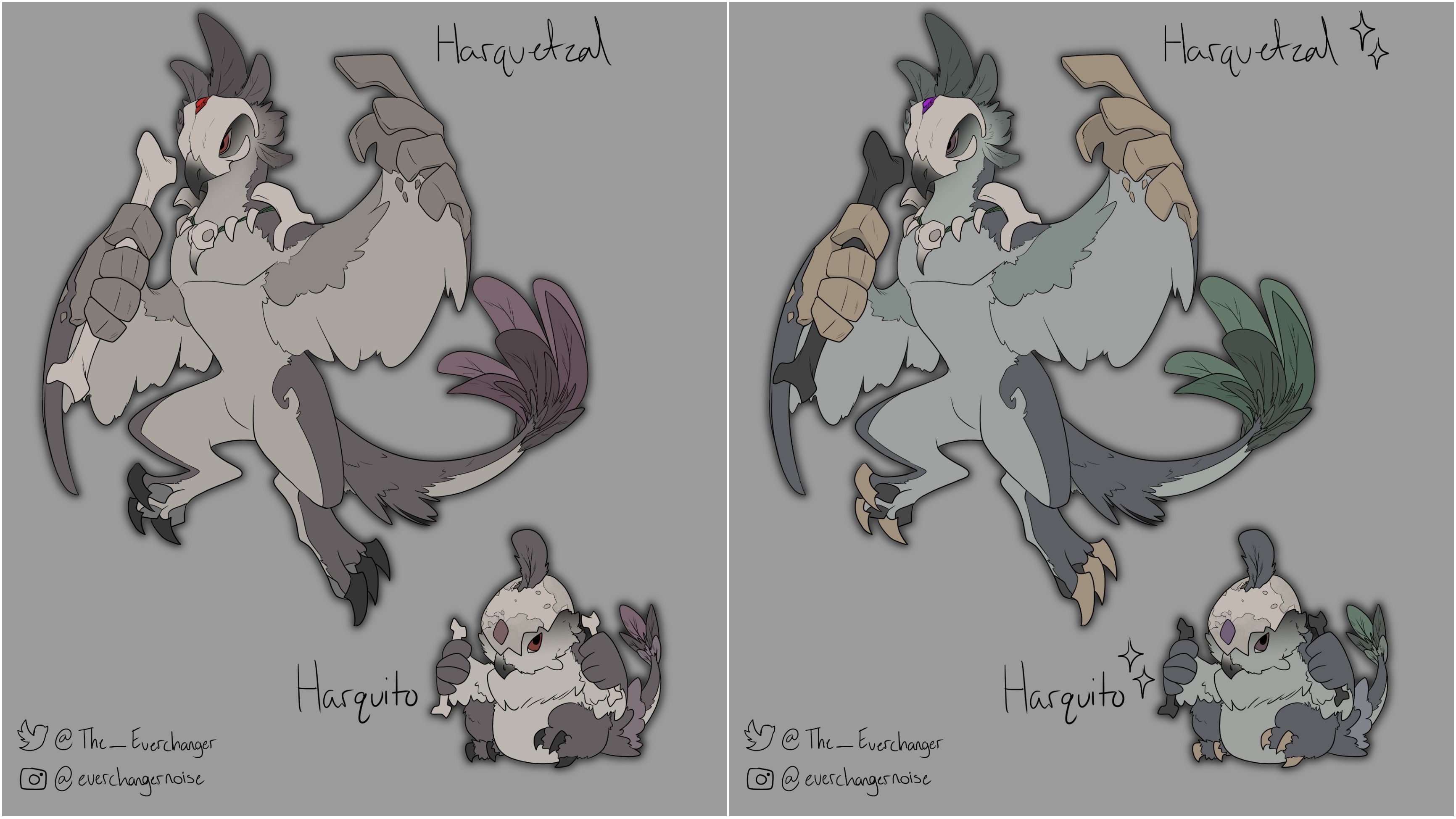**Harquetzal:** As adults, Harquetzal replaces the egg shell on their heads with an old skull (think of the Cubone and Marowak correlation). They also like to adorn themselves with other old bones as a sign of good hunting. Harquetzal are known for their powerful legs and incredibly sharp talons, but on top of that they cover the ends of their wings in mud and rocks to make for more powerful blows. Just as well, they switch out their two little bones for one large one that they carry for use in combat.The first pair of fakemon designs I made for a contest of sorts. Here's a little bit about these two! Submission #1! **Harquito** and **Harquetzal** I'm not good with typing for Pokemon, but I was thinking either a ghost(maybe?) or dark typing with ground or flying. Both evolutions were based on the harpy eagle, the bone motif coming from the large amount of bones that can be found in their nests. Little bit of info for dex entries: **Harquito:** born with flimsy legs, Harquito usually stay within their nests and play with the bones and sticks that litter the insides of their home. They like to make a lot of noise banging around their two favorite bones that they never let out of their sight. **Harquetzal:** As adults, Harquetzal replaces the egg shell on their heads with an old skull (think of the Cubone and Marowak correlation). They also like to adorn themselves with other old bones as a sign of good hunting. Harquetzal are known for their powerful legs and incredibly sharp talons, but on top of that they cover the ends of their wings in mud and rocks to make for more powerful blows. Just as well, they switch out their two little bones for one large one that they carry for use in combat.0 Comments 0 Shares 1 Views -