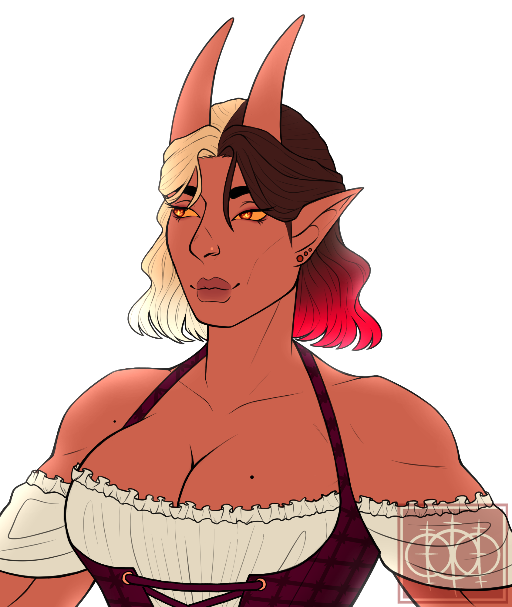 Satari is a Cleric of the Forge Tiefling that I haven't gotten to play yet, but maybe one day.