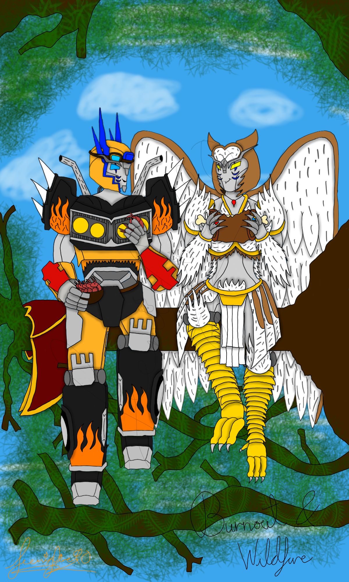Now for the kids of Feenixfire from the Gearverse! **These do not appear in the Japanverse.** Burnout is the Eukarian Prince and future ruler of Eukaris, he was born as the next Windwarrior to inherit the title and job to protect Eukaris like his ancestors before him. Wildfire is the Eukarian Princess and was actually meant to be the next ruler, however when she discovered she was a Cityspeaker to Chela, she decided to abdicate from the Throne to focus on serving Chela as the next Cityspeaker. Burnout takes after his father with a more Cybertronian looking body and alt mode, a mixed hot rod and pickup truck Cybertronian mode. While Wildfire takes the form of an Snowy Owl eagle like bird found on Eukaris. Sparked on Cybertron but born in the Mid-Summer rains to a just married Wrecker Gearchange and the then Princess Feenixfire Lockheart. Burnout and Wildfire were a groundbreaking duo just for being very high ranking Hybrids, the first of their kind in that rank and importance. Becoming instantly a symbol of the Hybrid population both on Eukaris and its other colonies. As Burnout and Wildfire grew up, they were dotted on by the Lockheart family, even by Sunrise who... although wasn't a great parent due to her mental health issues, threw herself into helping Feenix and Gear with the upbringing of the twins. Dezmi knew that his new grandson was the next Windwarrior and as such started to help care for him and train him into his roll. It wasn't discovered till just before the twins were sent to the Academy that Wildfire was actually a upcoming Cityspeaker, one born without the markings which was highly unusual. They found this out after taking the kids to see the Titan herself during the Coronation of Feenixfire and Gearchange... and Wildfire started hearing Chela's voice in her head and directly started speaking to Chela... This meant Sunrise took Wildfire under her wing and started training her in the ways of the Cityspeaker alongside the intervention of Lady Serafina Wellborn into the lives of the pair to help train them both in their new ways. During this the pair was sent to The Academy to learn military training and other curricular education where the two created the Misfits, a group of friends banded together. First members included: Singtoa the 2nd (cousin), Icarus Featherborn (fellow hybrid), Tuscona Jacklehound, Ebonwing Butchana. They were joined later by Burnout's bully Spirodron De Cagliostro, son of Grimmsbane and Chayara (after Burnout knocked out Spiro in a fight) and just before The Trials, they were joined by Terrans Amaterasu and Hanzo, transferred from Earth after their father sent them back to Eukaris when the Autobots and Decepticons started fighting on Earth. They were also joined by Systemcheck and MOTHER after the mech escaped Space Pirates enslavement and found protection with The Academy. When the group graduated from the Academy and begun to serve in the Military Police force that all graduate start in (Eukaris is a national service planet that requires all post Academy graduates service in some capacity in the Army from ages 18-25, unless they are already in an apprenticeship, family, professional or otherwise). Working in both protection, police work and other duties together, as well as training to be a Windwarrior and a Cityspeaker respectively. It was a miracle they found time to do much else. However Burnout started dating his best friend Ebonwing and on his days off, he helped her both hunt and worked alongside her at her family's butcher shop. Wildfire on the other hand avoided dating and turned her skill to the arcane Chi arts alongside her Cityspeaker training (many thought she was avoiding but it turns out she was actually asexual.) For the final year of Army service, the Misfits were sent to Earth to help the Autobots as well as to help improve Cybertronian Eukarian relationships. In which they were welcomed by the Autobots (especially by Bulkhead and Wheeljack who served alongside Gearchange in the war), and learnt not only about Cybertronian kind, but about the humans that worked with the Bots, mainly Jack, Miko and Raf. However... During this time Eukaris came under attack from within as Grimmsbane started a major civil war against Feenixfire and co., and with Gearchange injured by Tox-en Mechologic weapons, this caused Feenix and the family to go underground and fight back best they could with the chaos... The Misfits got news of this and returned to Eukaris where they are currently fighting against Grimmsbane and his cohorts.0 Comments 0 Shares 61 Views -