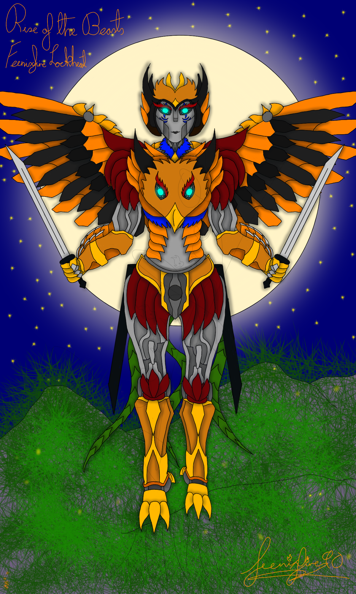 Feenixfire Lockheart is a Maximal hailing from the planet of Eukaris/Biosphere/Jungle Planet. Known as the Queen of the Eukarians, her family known as the Lockhearts are the current rulers. The Lockhearts come from the Horizen clan, or as the Cybertronians nickname them, the Cloud Walkers, who come from a huge city-supporting tree called Nibel.