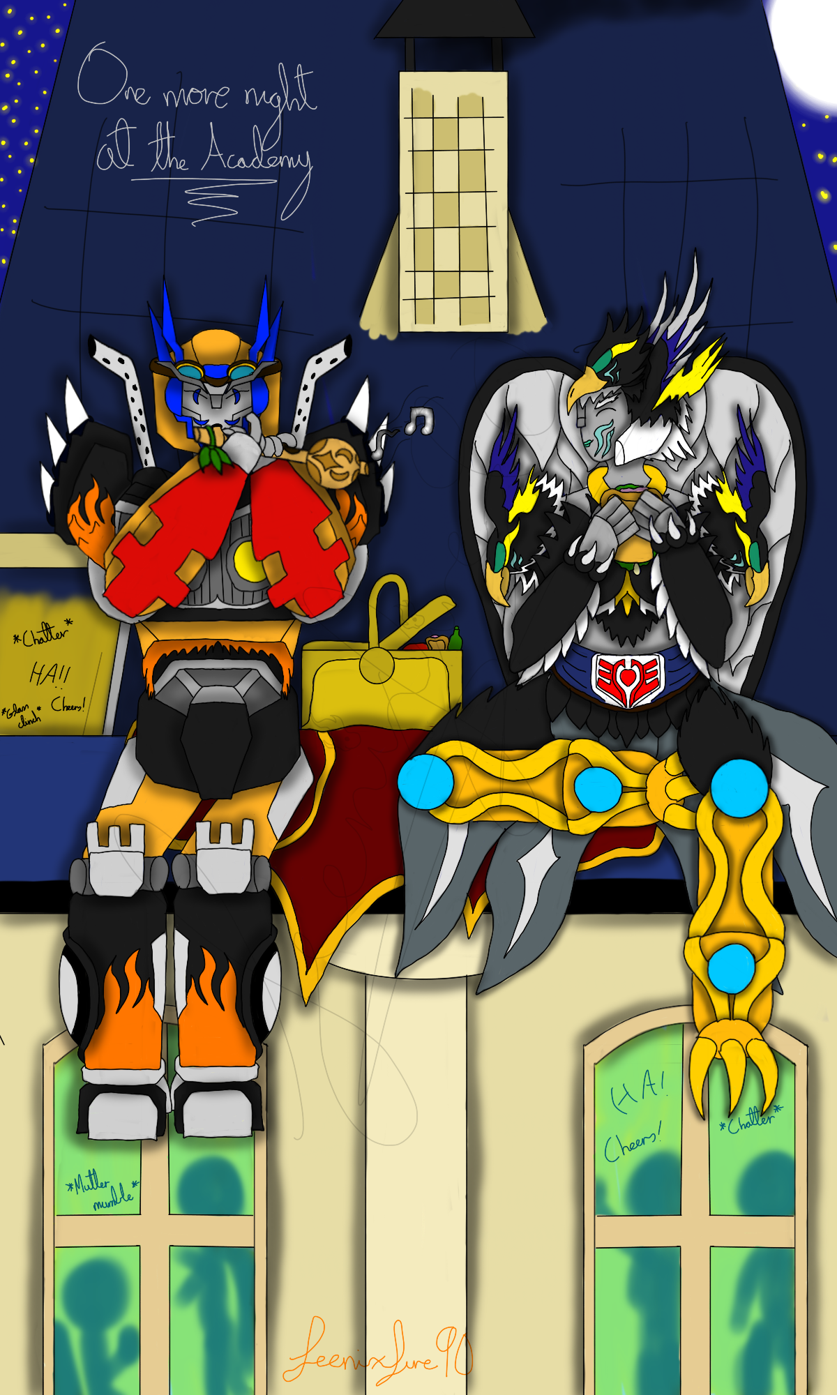 This artwork's context is that this is probably the final night at the Academy before the of-age Eukarians are taken to the Trials. Which is an event for of-age (was 16, but Law of the Sparklings brought in by Feenixfire changed this to 18) Eukarians to prove their worth and transcend into adulthood. And while everyone is celebrating downstairs and partying, Ebs and Burns here are enjoying a moonlit picnic and some peace to reflect on their time there.Old art piece that was done for a pal. @Cakeski's OCs Burnout Lockheart and Ebonwing, a rather cute couple that met in the Academy. Which in my story is the first and best Military school for Eukarians (but is one of many throughout the planet), and is often the ones attended by the citizens of Chela City and High class throughout Eukaris sending their kids there. Burnout is the son of Gearchange and Feenixfire in the Gearverse (Transformers Prime based) and Ebonwing is the daughter of the Royal Accredited Butcher for the Palace. They met as kids when her father used to bring her along for deliveries to the palace, but got to know each other when they were 12 when they started attending the Academy. This artwork's context is that this is probably the final night at the Academy before the of-age Eukarians are taken to the Trials. Which is an event for of-age (was 16, but Law of the Sparklings brought in by Feenixfire changed this to 18) Eukarians to prove their worth and transcend into adulthood. And while everyone is celebrating downstairs and partying, Ebs and Burns here are enjoying a moonlit picnic and some peace to reflect on their time there.0 Comments 0 Shares 55 Views -