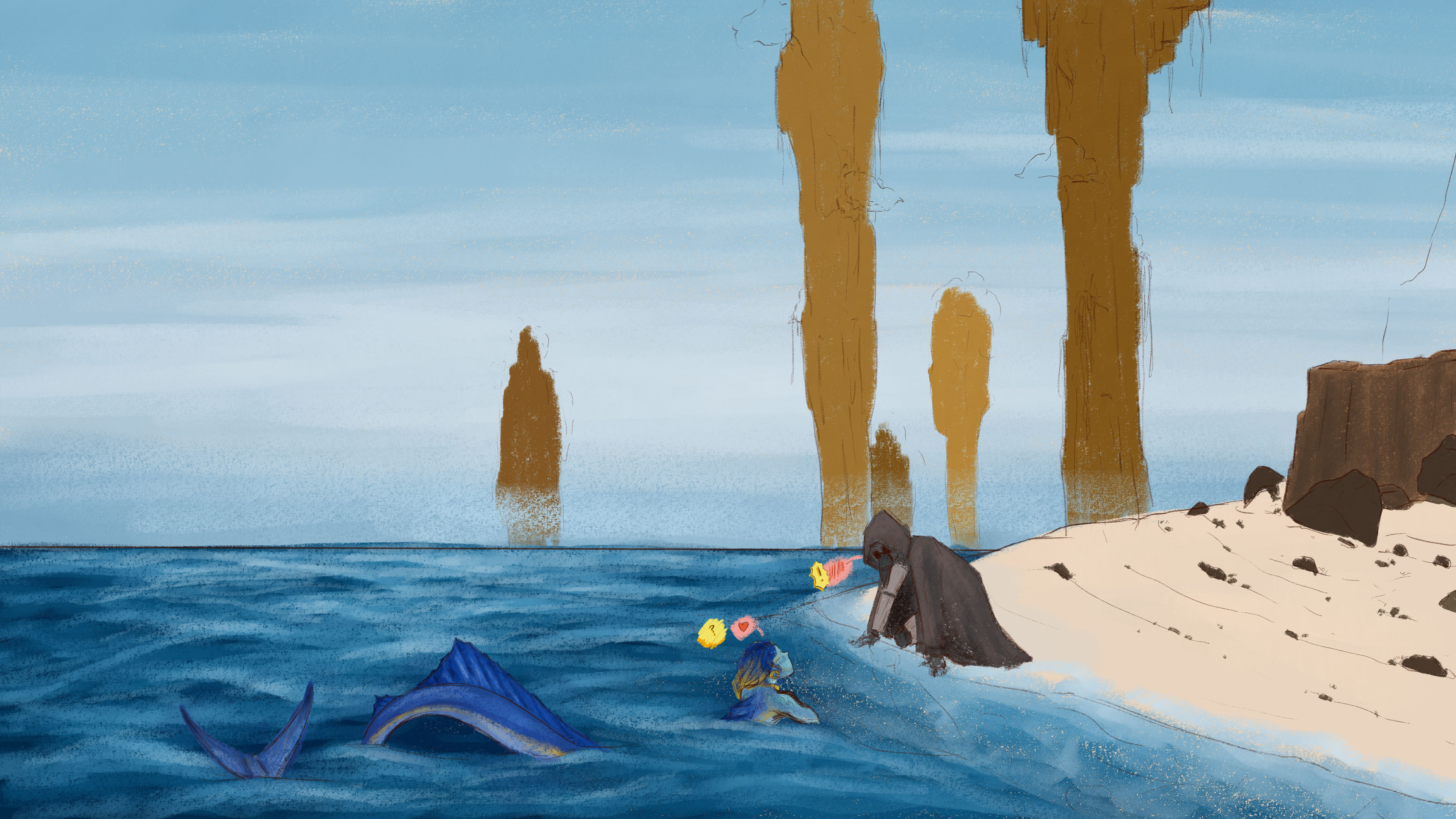 (originally posted to [tumblr](https://www.tumblr.com/artoffict/738622997424979968/crow-and-sailfish-wip-this-ones-been-hanging) )