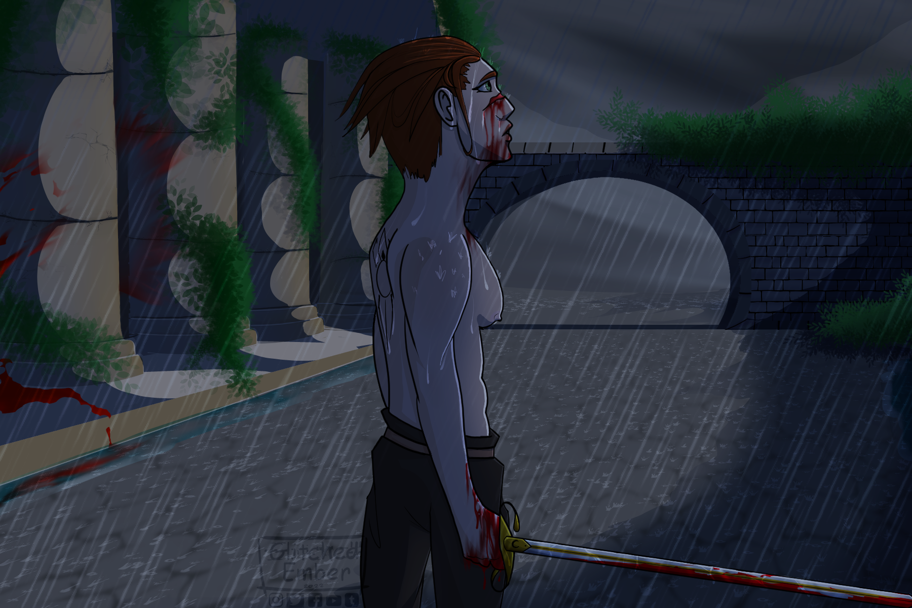 This took a bloody (Heh) long time to finish, but I'm quite happy with the outcome. I decided to actually teach myself how to draw backgrounds and despite that slowing the completion by a lot, I have learnt quite a bit from this.