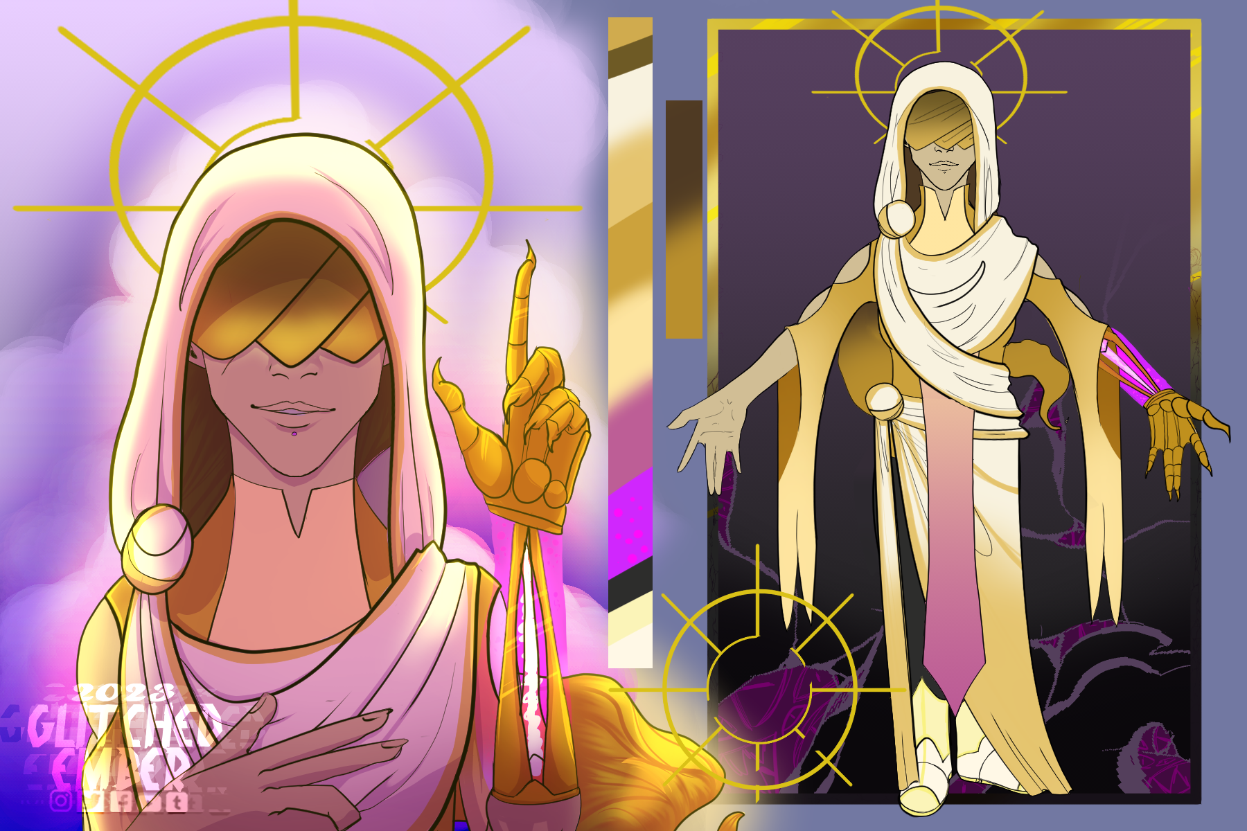 Her left arm was lost when she became a God and was replaced with a gold skeletal prosthetic in its place, with a purple beam, made of pure magic and her eyes are hidden for a reason that I won't explain yet.