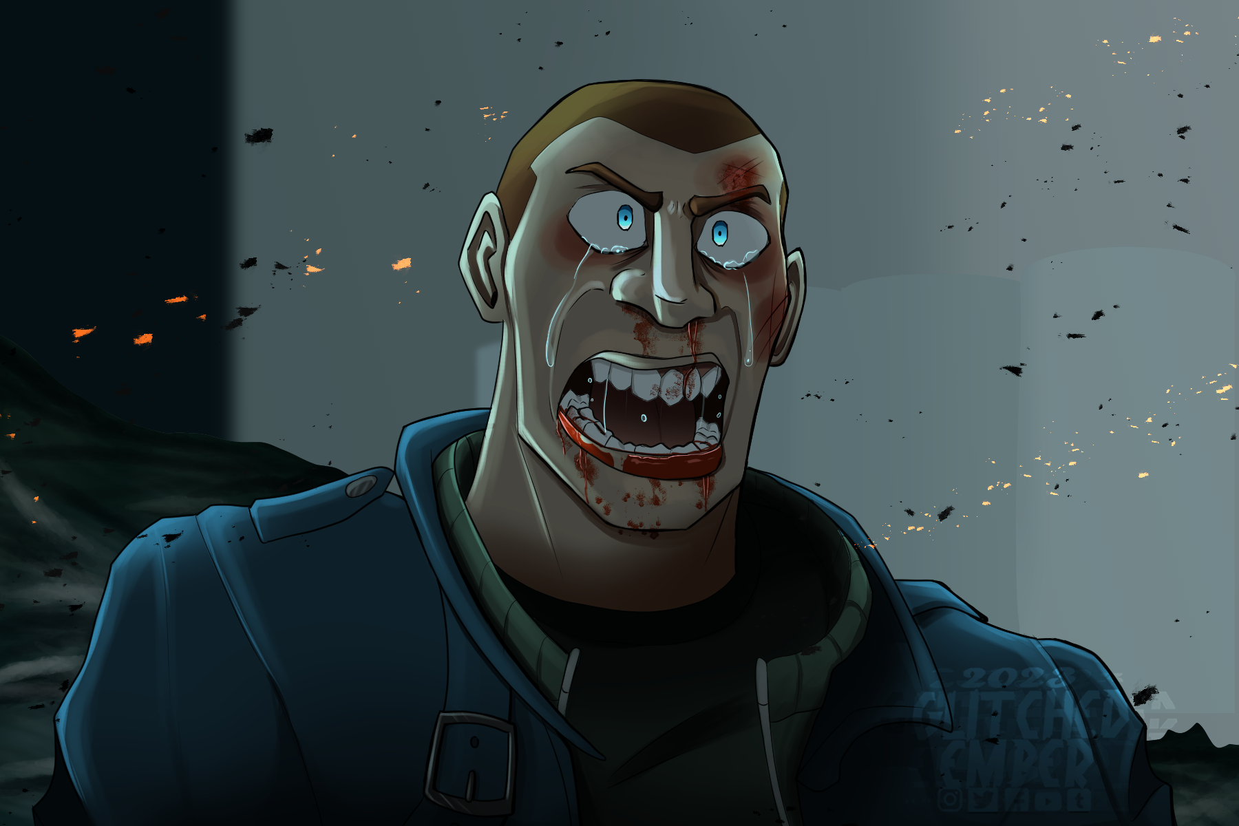 Have a nice day/evening/night!!Survivors Guilt. "a mental condition that occurs when a person believes they have done something wrong by surviving a traumatic or tragic event when others did not." I wanted to do a screenshot redraw from a Team Fortress 2 SFM film on YouTube called Emesis Blue. It's meant to be a psychological horror with a bit of analog horror, with a story that's quite confusing on your first watch, but it's so cool! There are many references to other horror movies, like The Shining (1980), Se7en (1995), Evil Dead 2 (1987), Dr Strangelove (1964), and many more. Drawn with: Clip Studio Paint EX Time taken: 6 hours Music or Show while listening: Lose my mind in Hysteria - FakeFast I do not consent to having my work used as N.EF.T.'s, used in A.I., stolen/ traced, or used without credit. Have a nice day/evening/night!!0 Comments 0 Shares 5 Views -