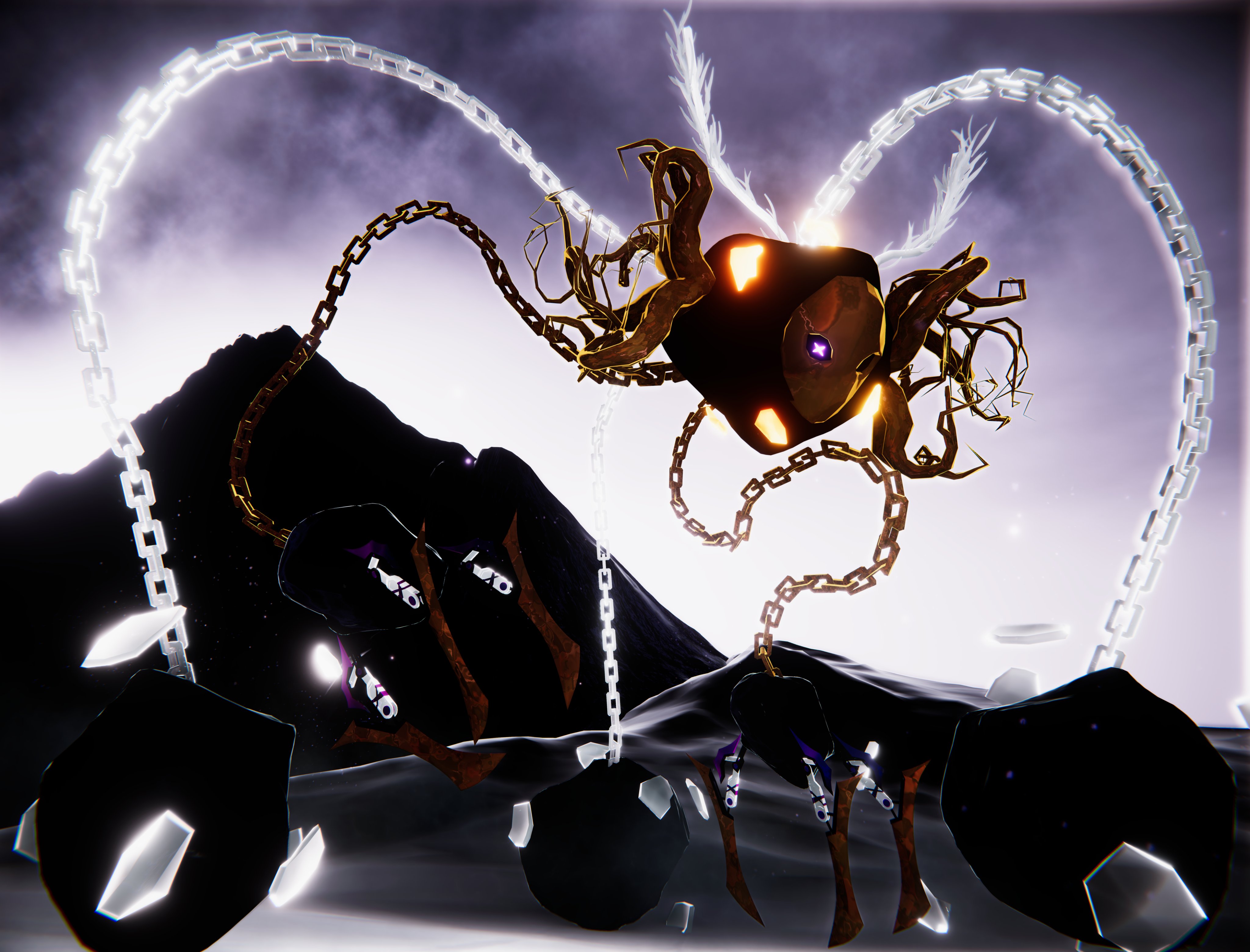 -Hans was given the body of a rock-like beast, with three chain legs with boulders on the ends to act as legs. Hans also has two golden chain with rocks attached as well as three blades to act as fingers.
