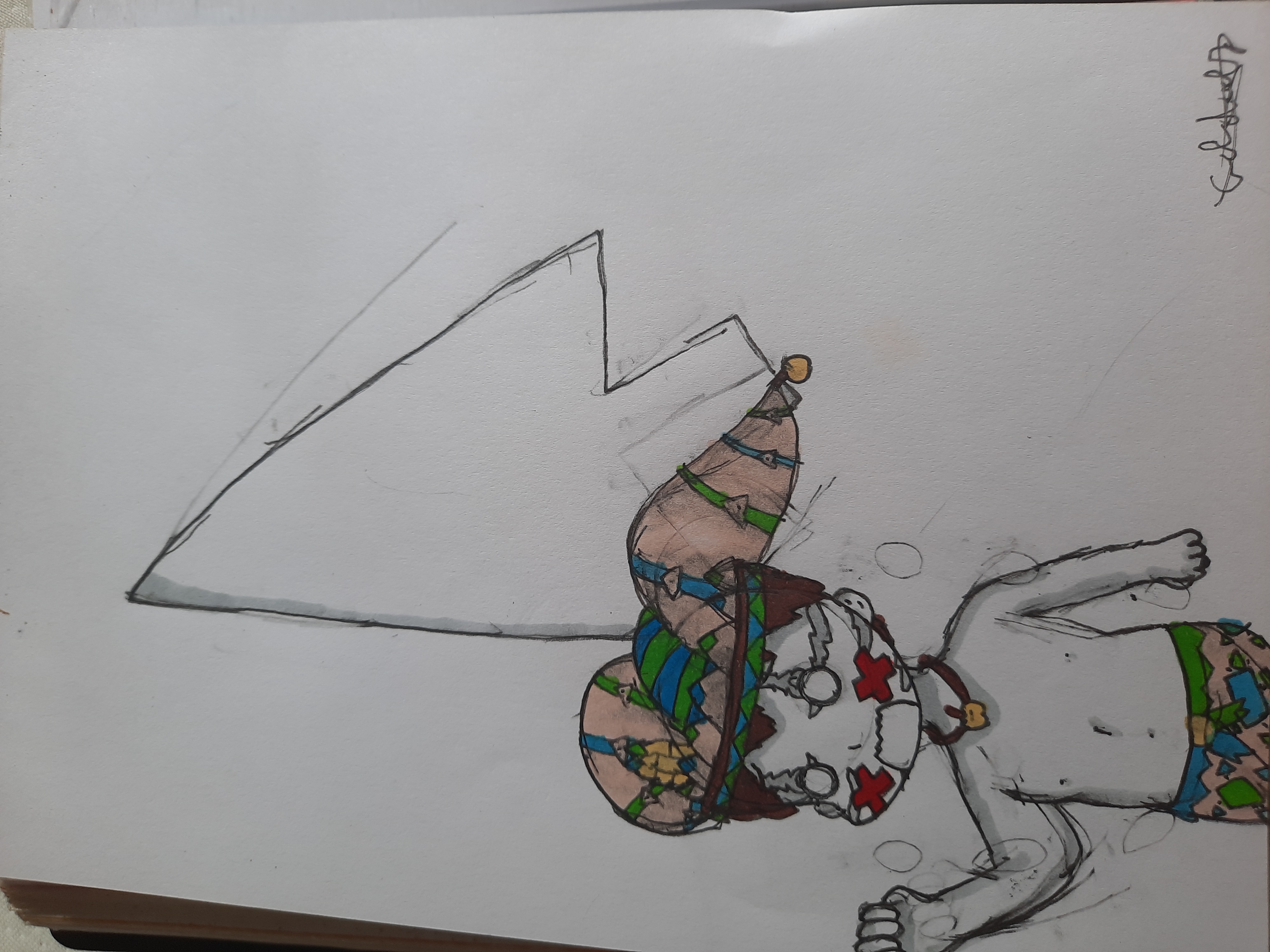 So yeah. That's all I have to say for right now. See you in the next drawing!Hello, everyone! This is my very first time posting on Inkblot. First off, I gotta give a huge thanks to another Inkblot user "@MingoPinku" for introducing me to this app, even though, I've should've done that a while ago. Silly me! Anyways, I'll try to keep my introduction fairly short. My name is Goldool and I love drawing unusual things with my OC, Tribochool the tribal jester boy who also has superpowers which we will get to later. I used to post on Instagram, but because of its stupid algorithm, it gave me quite a bit of stress and and it wasn't good for my mental health. So now, I will post on there and Artfol (goldool_7). I feel like both of these socail medias are way better than Instagram. That's all for my introduction from now on. On to what's happening with my drawing. Here we have my OC, Tribochool fighting against his rival, the Cursor. That's based off of an animation that I've done about two years ago and uploaded on Youtube back in 2021. It's called "Tribochool meets lil' entity". Not the most clever name that I could think of, but oh well. And this drawing is about 1.5 years old. So yeah. That's all I have to say for right now. See you in the next drawing!0 Comments 0 Shares 2 Views -