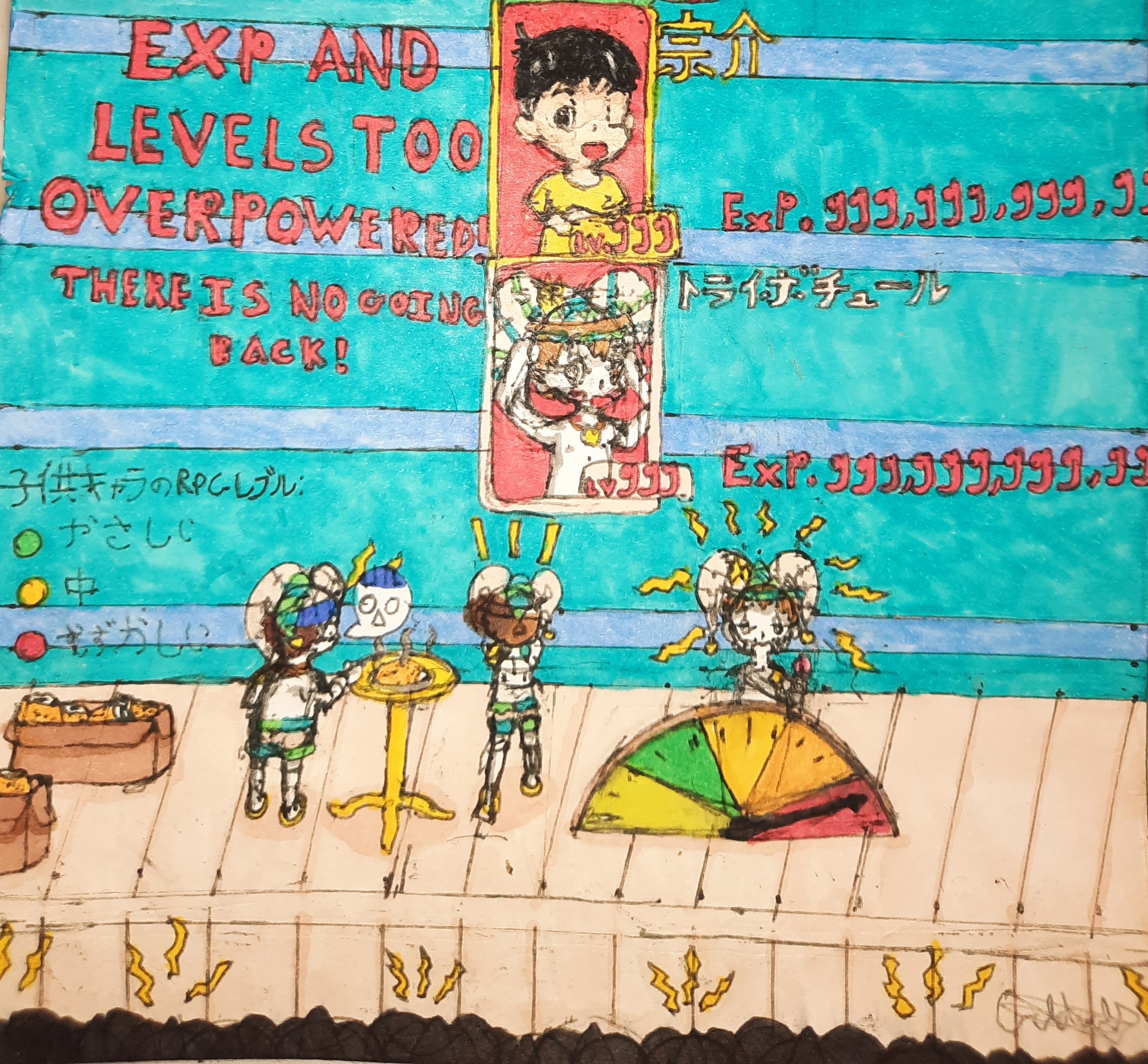 Again, Merry Christmas and I'll see you in the next drawing!First off, Merry Christmas. I'm currently working on another drawing that I'm planning to finish before New Year. Secondly, the Tribochool clones have been watching the EXP and Levels' numbers growing, while one of the Tribochools was pulling to lever to make the numbers go faster and faster. But it was until the Tribochool pulling the lever has broken it by accident (R.I.P. lever, you'll be missed), and now the numbers have gone up by an incredible amount. Oh no! This is worse than I thought. I mean, I love higher levels in RPG battles as much as the next person, but this is waaay too much. MAKE IT STOP NOW!! Wait, is that... Sosuke?! Sosuke from "Ponyo"?! What in the living heck are you doing there? How did you get here? Gosh! I'm asking too many questions, right now. I'm gonna escape from here, and hope that the Christmas drawing won't be as stressful. Again, Merry Christmas and I'll see you in the next drawing!0 Comments 0 Shares 2 Views -