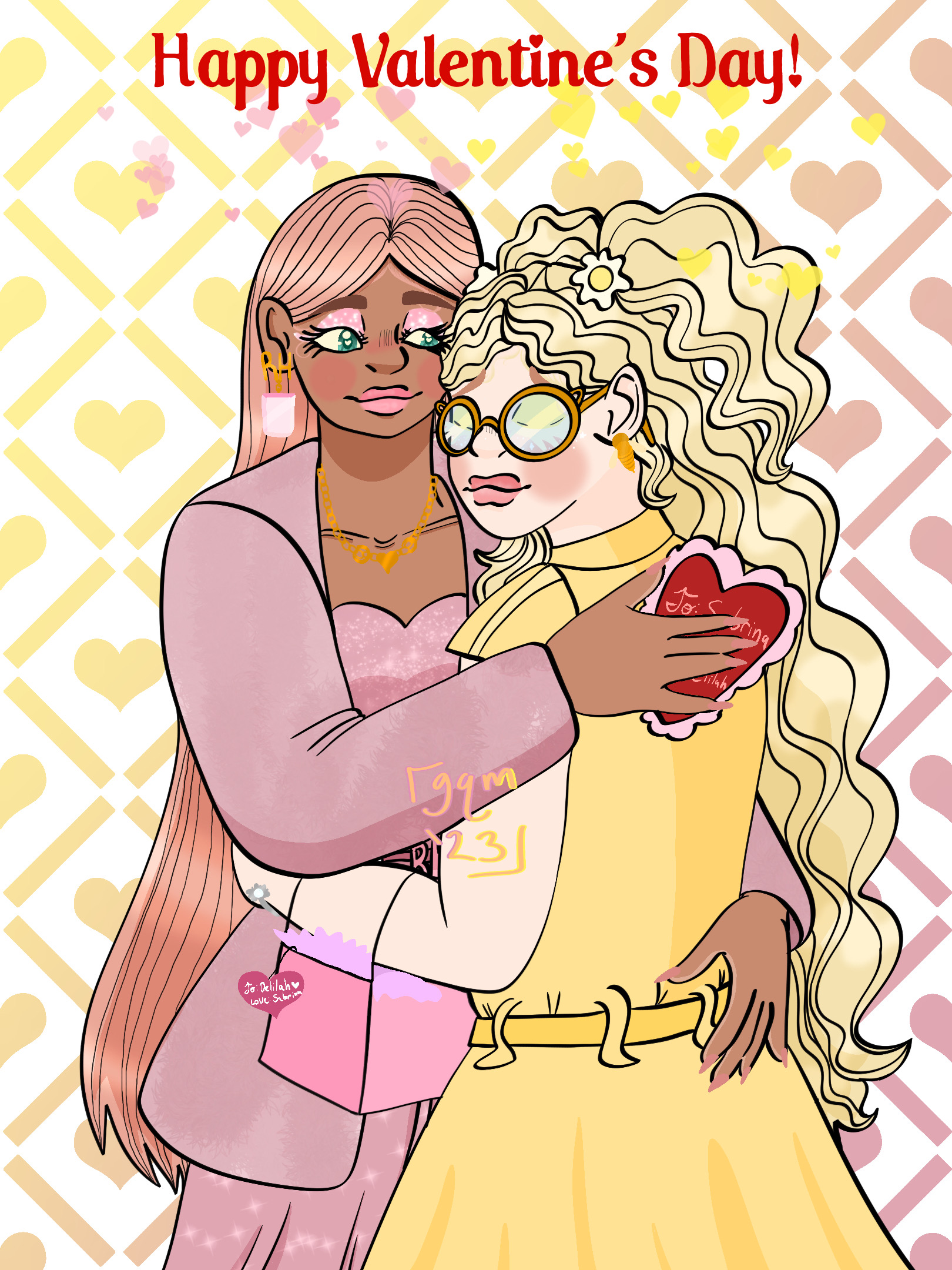I held a poll(did ya know tumblr has polls now?) to see which rainbow high ship I’d draw for today (since it’s Valentine’s and all). Delilah x Sabrina won the poll, with 49% of the vote! So here’s the happy couple celebrating the holiday with gifts and cuddles.