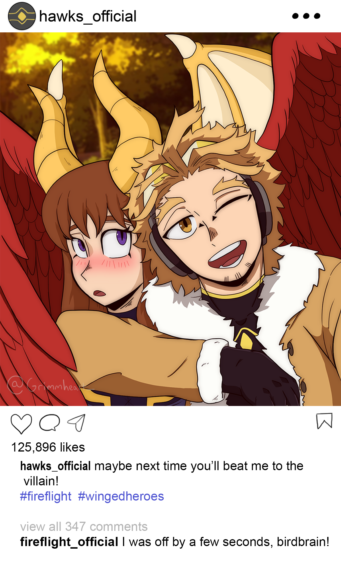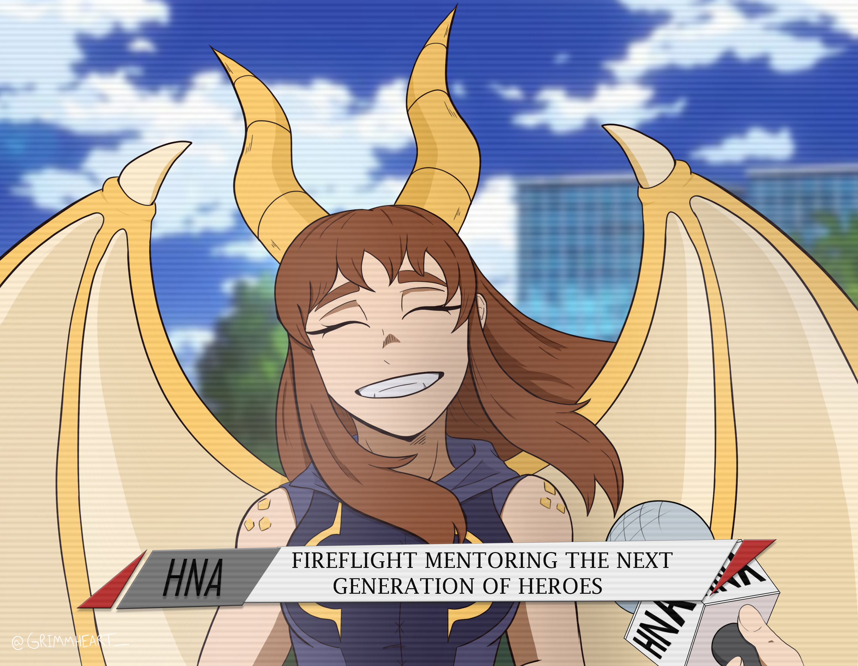 "Fireflight has been quite the popular hero! She's climbed up the ranks almost as fast as Hawks! She will be traveling to many hero schools to give them advice and training."
