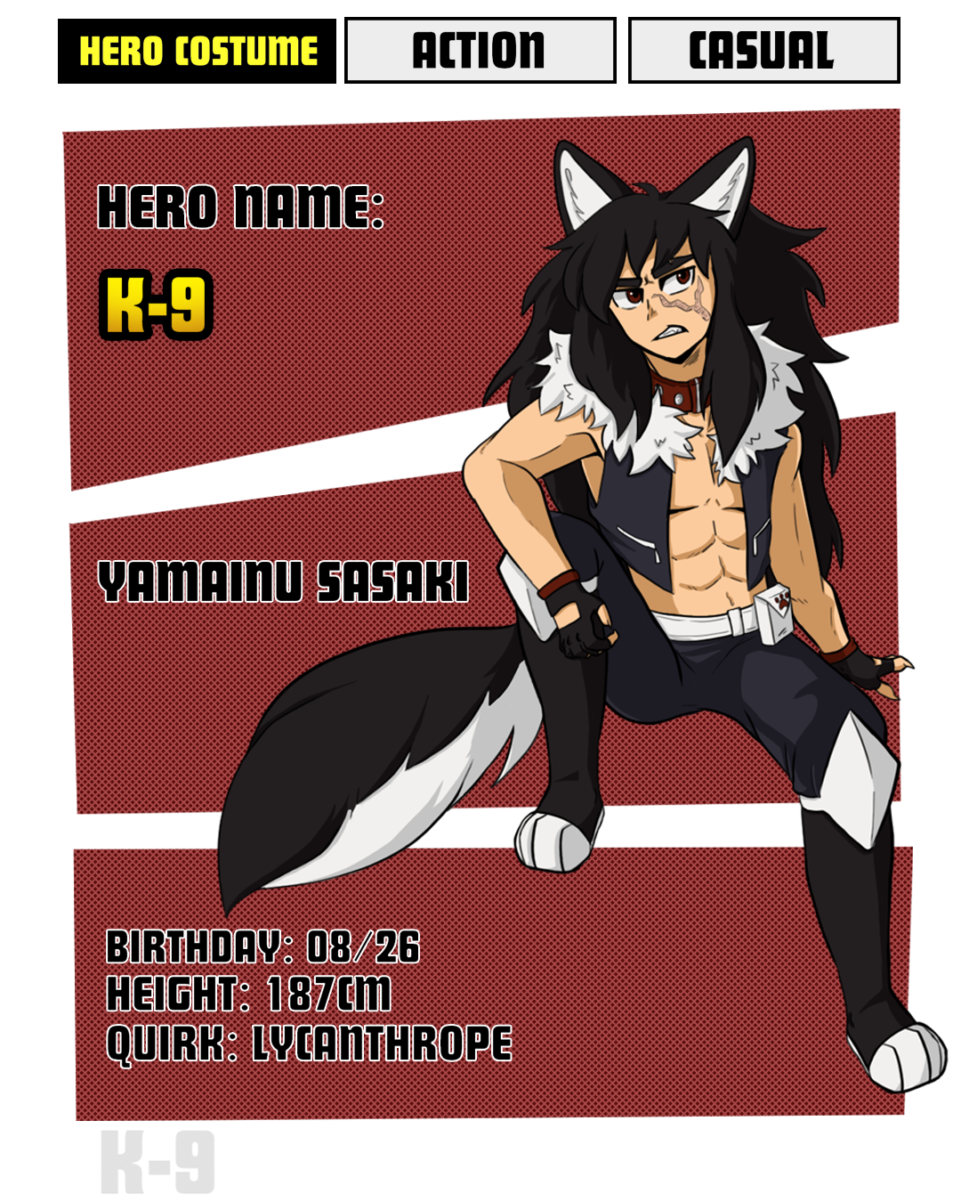 He is protective of his coworkers, he has a big heart but refuses to show it much.K-9: The Werewolf Hero AKA Yamainu Sasaki Quirk: Lycanthrope Yamainu is able to transform into a huge powerful (and fluffy!) werewolf. He also gets wolf ears and a tail in his human form. His sense of smell and hearing are heightened as well. Yamainu is a hot-tempered and gruff sidekick working under the pro hero Fireflight (my main MHA oc!). He acts quite hostile towards others except for Fireflight. He has a soft spot for her. Yamainu is 21 and graduated from Shiketsu. During his license exam, he got injured and was on the verge of failing. Fireflight was from Seiai and yet she still stopped to help him pass. This made him loyal to her as he feels like he needs to repay her for this. Once he heard she set up an agency, he instantly applied. He is protective of his coworkers, he has a big heart but refuses to show it much.0 Comments 0 Shares 4 Views -