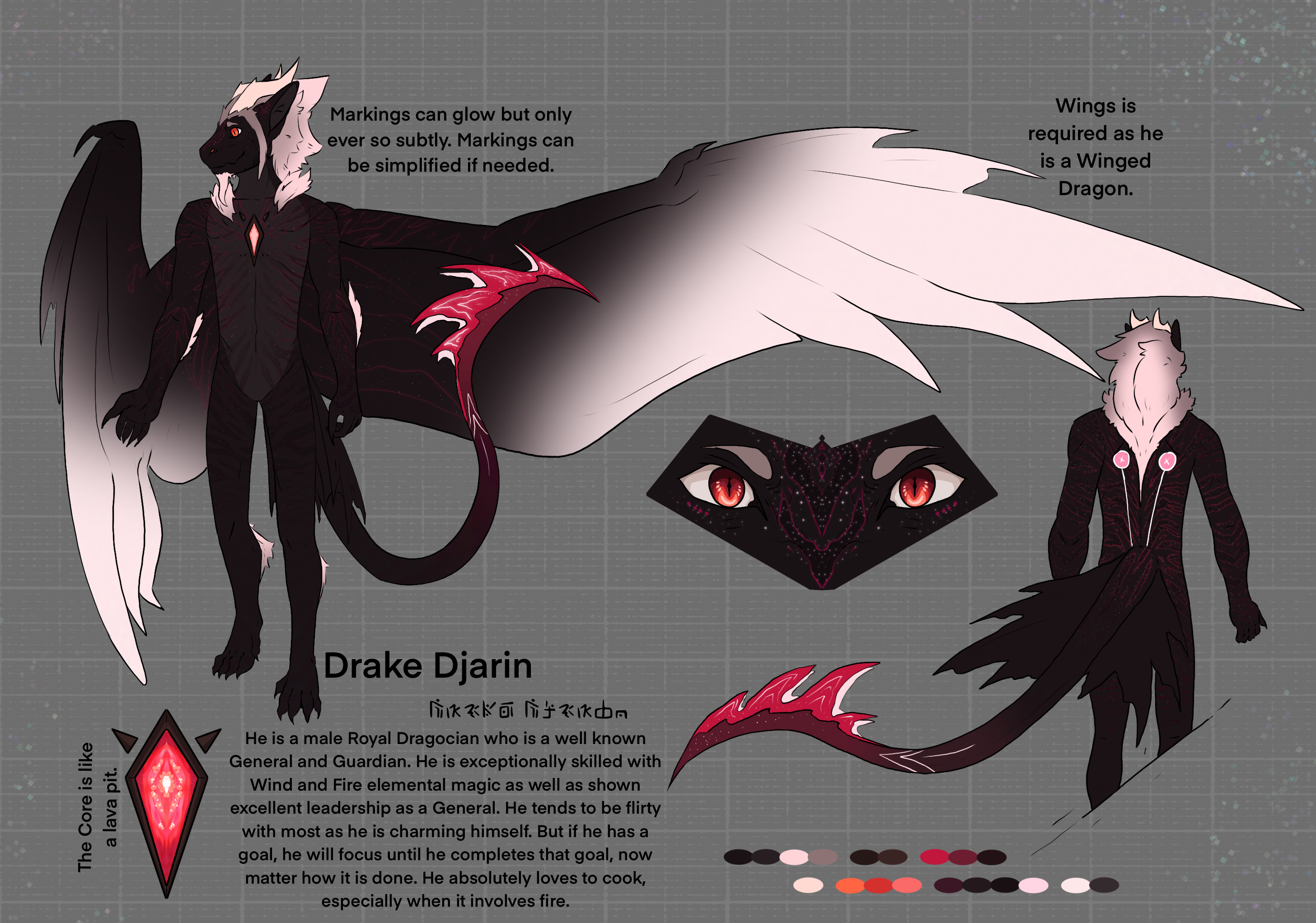 Now, that I have finished this ref sheet in two days. I need a icon for him. Haha.. 🫠Made a new OC for lore purposes and stories! Finally got him drawn and his own reference sheet since he needed one since last year. XD (Technically ever since I started writing The Mandalorian AU and I thought him up but never really sat down and draw him?) But anyway, a little information about him! This is for another universe as well! He is in the Mandalorian AU as well. But just the basic information to get to know him first. Drake Djarin is his name. He is a handsome male Royal Dragocian who is a General and the Guardian of the Iyarius (the Sky cities). He absolutely loves to cook! Especially when it involves fire. Haha! He would teach Akumu how to season and cook food as it is his favorite hobby. (Akumu just loves it cuz she can spend time with him.) While he is a Royal Dragocian, his family is not Royal nor it is considered Royal, due to a buried secret that became unburied. A tiny sliver of Human DNA was found, which means someone in the bloodline was in fact human. Akumu doesn’t care at all since she was once human herself. But unfortunately, Akumu is considered Royal because of her title “Queen”. If they marry, her last name will be pass on to Drake and any future offsprings. This is only because Akumu is the first in her line. By Royal Law, that must be passed on. But it conflicts the law since Drake isn’t Royal and had a Human DNA. If anyone finds out, this could cost Akumu’s title AND Drake’s title as a General. But neither of them will lose the Guardian title. (Fortunately, Akumu, as Queen, can change that law but it must be for a good reason. She is just waiting for the right time.) He is a quite formidable fighter to stand up against. Using a powerful heavy weapon to strike in one hit and run, which is his favorite tactic. Hit and run. (That also can include using his tail as a bait to nab that attention for striking.) He is very efficient in his skills using Fire and Wind element to his advantage. The relationship between Drake and Akumu is unique. (If that wasn’t obvious, they love each other very much.) At first, Akumu just brushed him off and shown complete uninterest to him. Drake was pretty much used to it since he tends to flirt and mess around as he is charming. Akumu didn’t really pay much attention until they worked together for a some time. Akumu saw that kind side of him, seeing him play with children and watching him play fight, telling stories. Drake is definitely very protective of the young ones and has shown that to Akumu many times. Akumu, over time, started to pay attention to him more to get to know him. Until on that one mission, Akumu had to save him from the fall into the current of the river. From that moment, they started to click. Now, they pretty much knew each other for over 50 plus years and are together as partners. Now, that I have finished this ref sheet in two days. I need a icon for him. Haha.. 🫠0 Comments 0 Shares 64 Views -