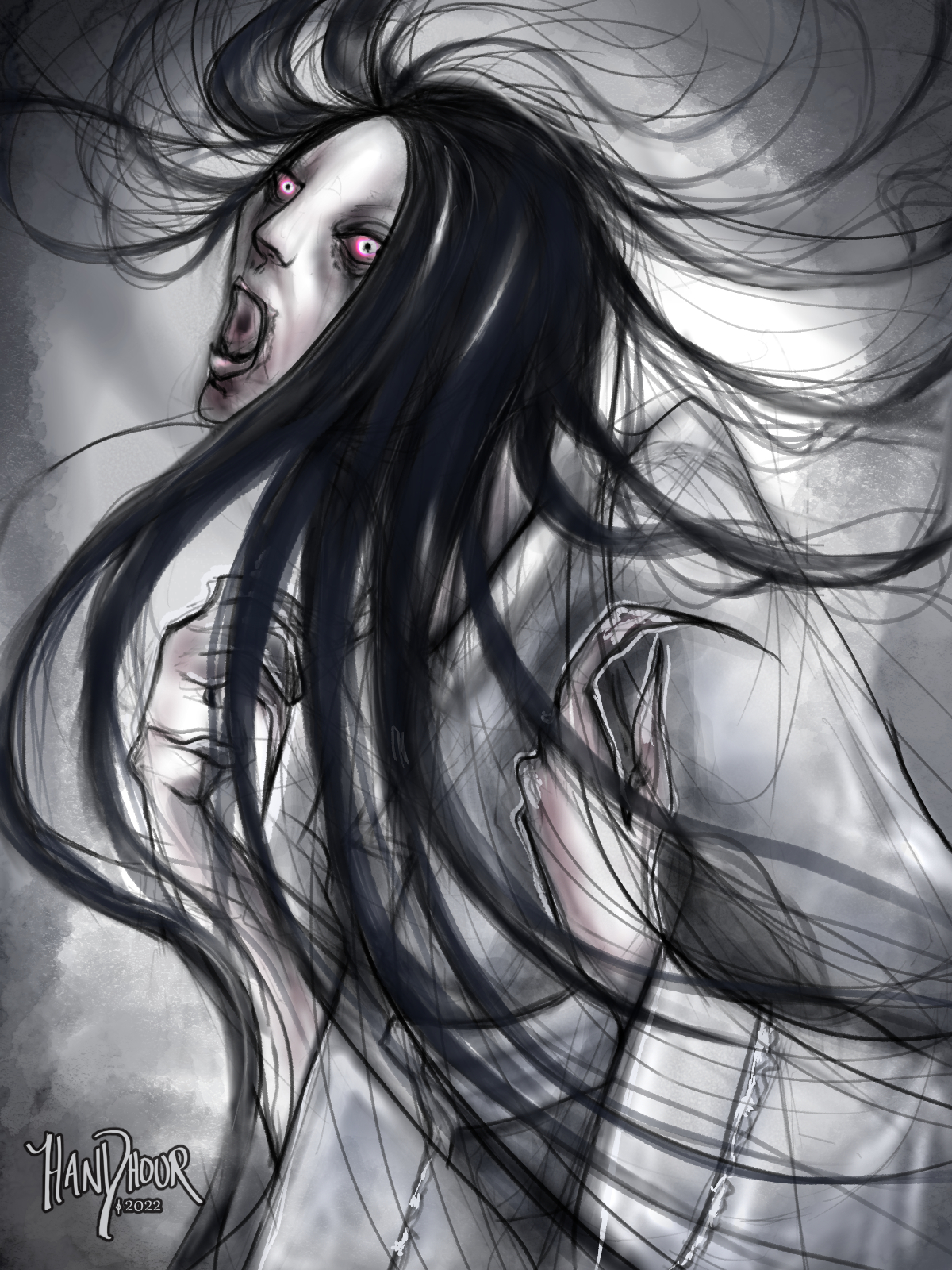 The Onyro of Japanese mythology, made famous by such movies and Ringu and Ju-On. A ghost with a longer history steeped in the long nature of vengeance, and how it can stain a place of death long past the time of its occurence. Always a horror of the cruelty of people and the supernatural that fascinated me in concept.