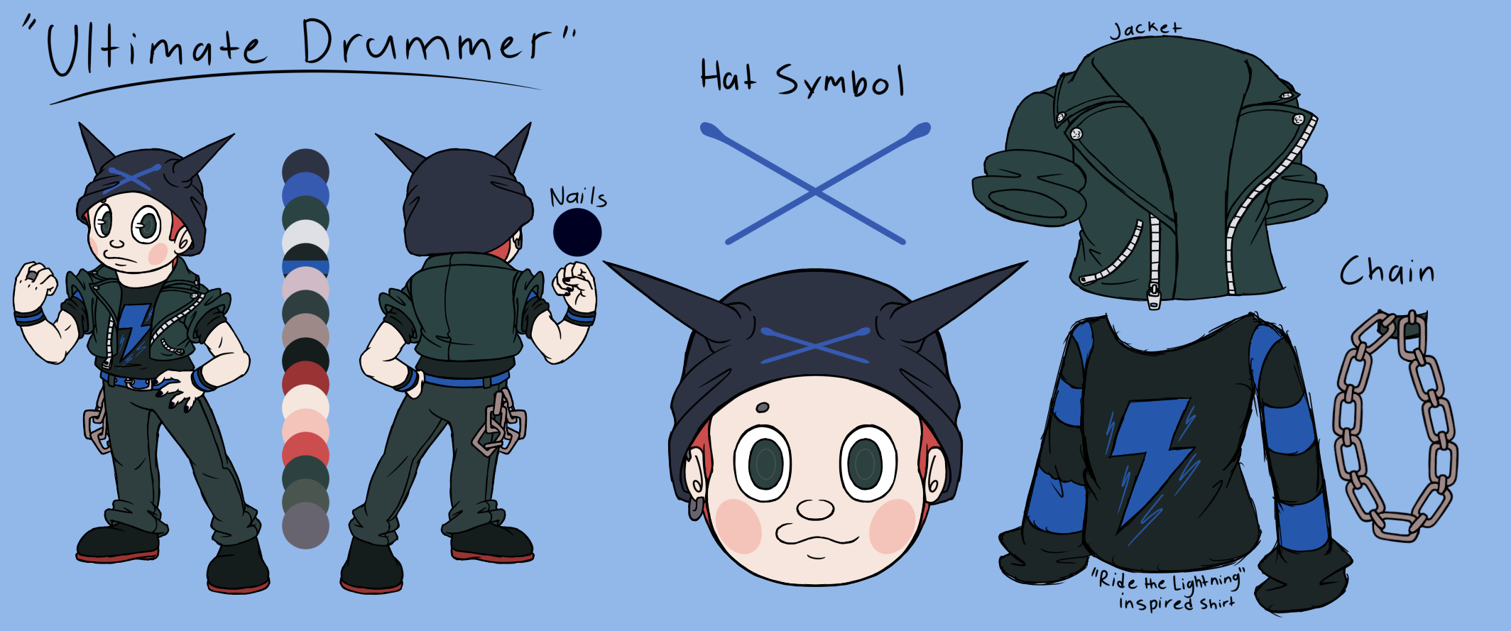 his legs and arms are already strong (or at least i assume) from playing tennis so i imagine it would help with playing the drums for long periods of time and very quickly which allows him to keep up genres like speed metal and thrash metal without getting too winded. his drum kit is specially designed for his height, and he's played at concerts alongside whatever famous bands exist in the DR universe and made a name for himself. still chews on candy cigarettes lol