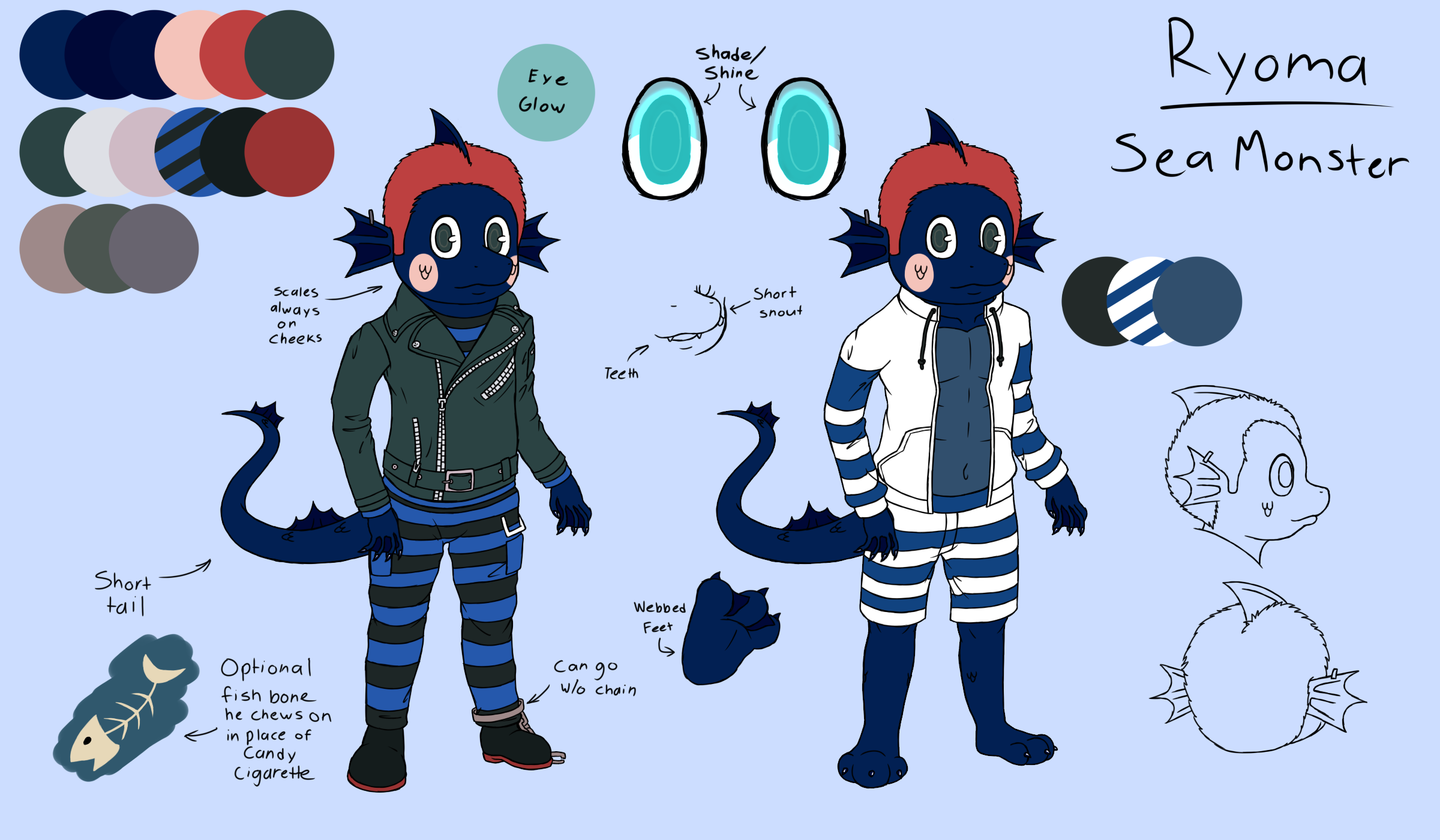 updated/touched up reference sheet for sea monster!Ryoma! i placed both outfits on one image instead of two + updated his color palette