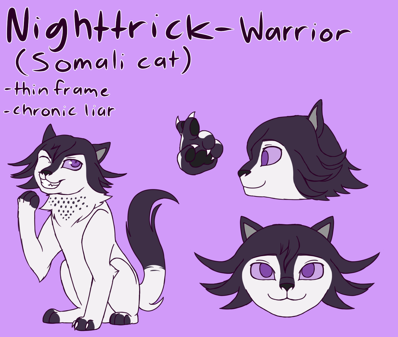 ("night" is a pun on "knight", like the chess piece)the resident prankster of Harmonyclan, Nighttrick is always causing trouble in camp. he lies and causes chaos so frequently, everyone is surprised he's a competent warrior. he uses his ability to lie convincingly to get out of conflicts with other clans, and is incredibly good at slipping through attacks from other cats. as long as he's not breaking the code, he can get away with just about anything. Spiderpelt repeatedly tells him to stay out of trouble, but he never listens. Nighttrick was originally part of a band of rogue cats that played petty pranks on other clans, but they all mysteriously vanished at some point. ("night" is a pun on "knight", like the chess piece)0 Comments 0 Shares 5 Views -