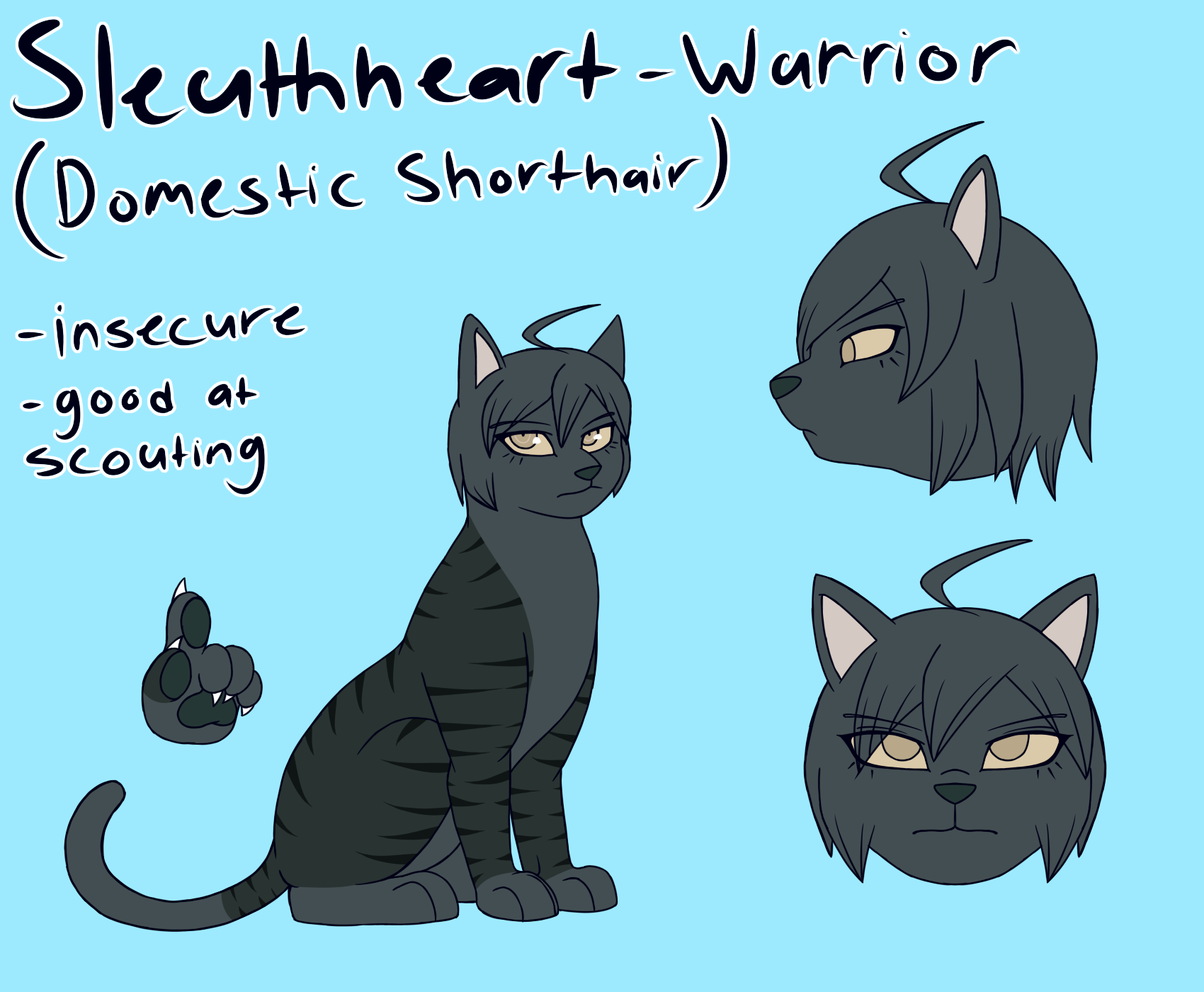 he is close friends with Moondapple, Scarletglare, and Harmonystar, who seems to take special interest in him.a soft-spoken, insecure tom. despite his insistence that he isn't that great, his skills in scouting, investigating, and analyzation are valued by Harmonyclan. in his old clan, his parents left him with his uncle to go roaming the world, leading to him growing a strong bitterness towards them. his uncle, who was his mentor and parental figure, taught him everything he knew about investigating and scouting in the clan. an incident occurred in the clan where a clan member's family was killed. although the killer was quickly found out, the killer turned up dead as well before they could be exiled. Sleuthheart, then Sleuthpaw, was miraculously able to solve the murder, the clan member whose family was murdered to be the culprit. they were exiled for seeking revenge, but not without them giving Sleuthpaw a hateful, burning glare that stayed with him for as long as he can remember. he was then made a warrior early and given the name Sleuthheart, and was guaranteed a future as deputy. he didn't want this, and so he made the tough decision to leave the clan, but not without promising to see his uncle again. he doesn't like the name Sleuthheart, but he eventually grows into it as he gets more confident. he is close friends with Moondapple, Scarletglare, and Harmonystar, who seems to take special interest in him.0 Comments 0 Shares 5 Views -
