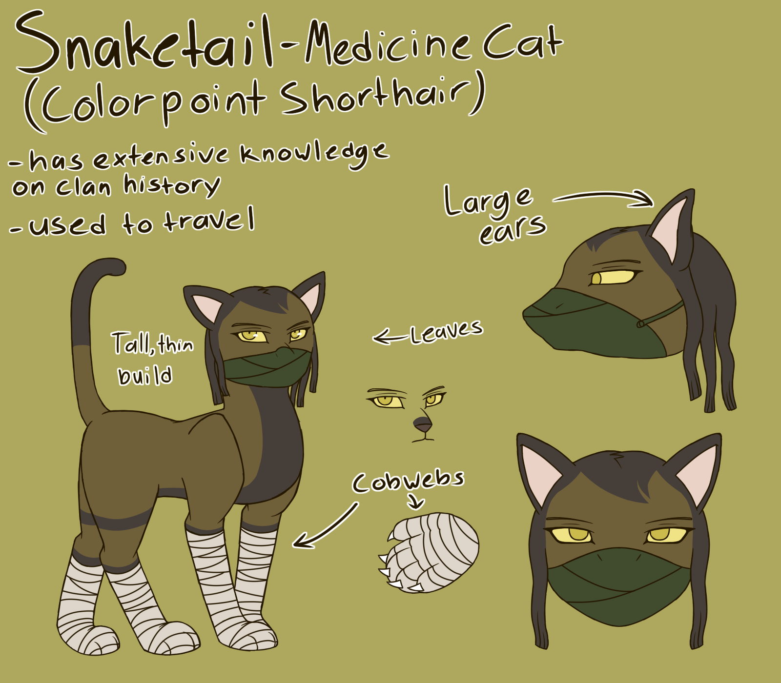 Harmonyclan's medicine cat. very mysterious, intelligent, and well-spoken, he naturally has a close connection with Starclan, but is also interested in studying and observing the Dark Forest. he has no interest in switching sides, he simply seeks knowledge. he originally traveled as a rogue, studying different types of clan life, clan history, and herbs. he constantly wears cobwebs on his legs and a mask made of leaves, and is never seen with it off, even while eating or drinking.Harmonyclan's medicine cat. very mysterious, intelligent, and well-spoken, he naturally has a close connection with Starclan, but is also interested in studying and observing the Dark Forest. he has no interest in switching sides, he simply seeks knowledge. he originally traveled as a rogue, studying different types of clan life, clan history, and herbs. he constantly wears cobwebs on his legs and a mask made of leaves, and is never seen with it off, even while eating or drinking.0 Comments 0 Shares 5 Views