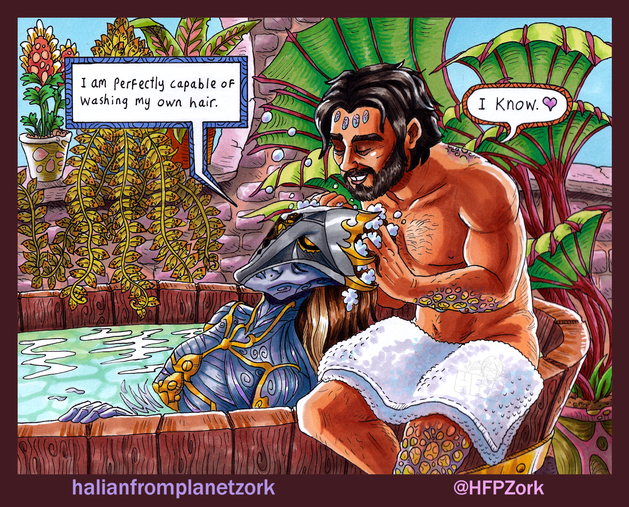 Done with Alcohol Markers.Made for Jayvikweek. Domestic. Viktor: "I am perfectly capable of washing my own hair." Jayce: "I Know.💜" This is the Post-Canon husbands enjoying their new life together in the house they built. Done with Alcohol Markers.0 Comments 0 Shares 31 Views -