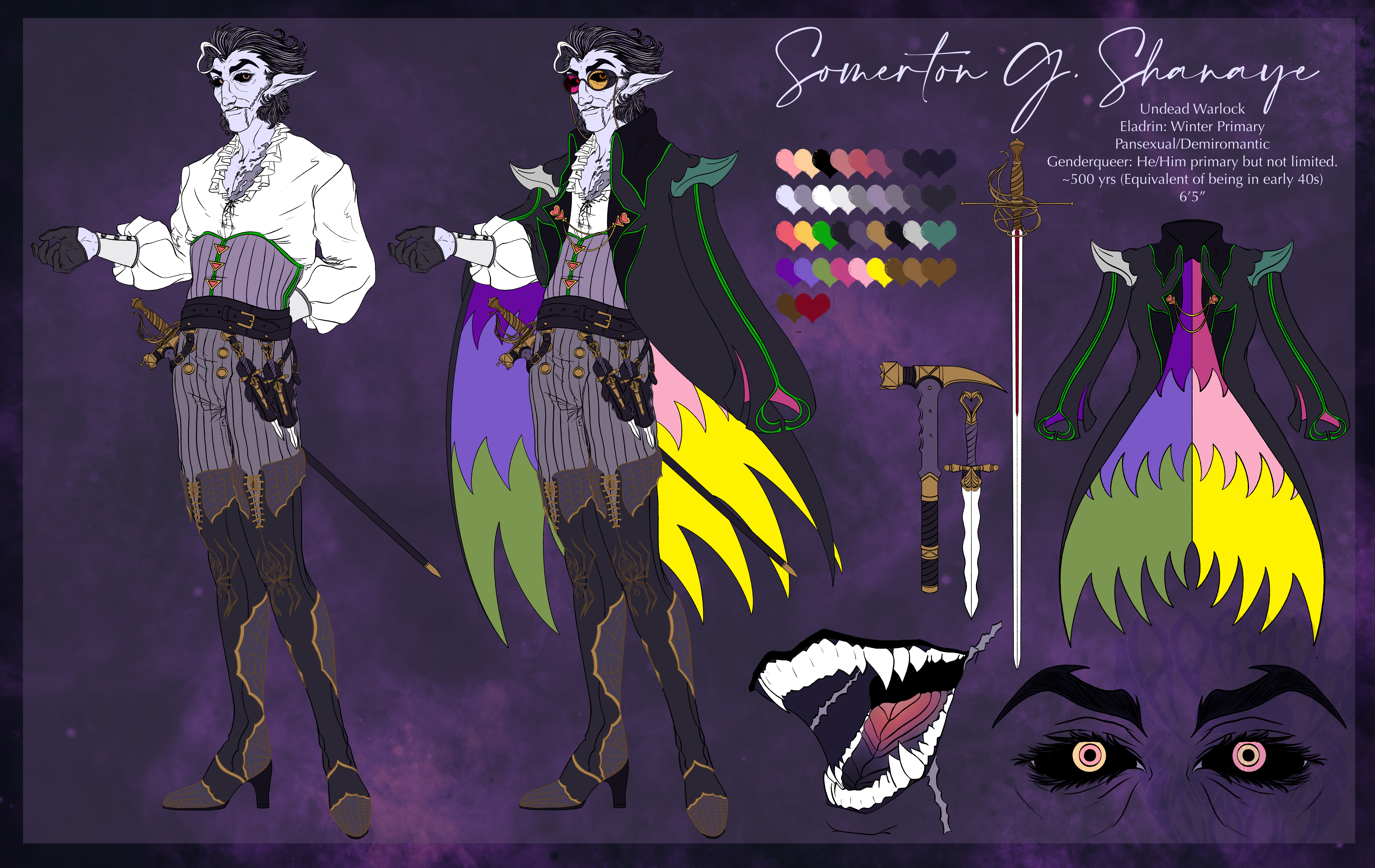 First post here and might as well get myself going. I am Horrorimus but you can simply call me Sparky! This is my Dungeons and Dragons character, Somerton, and if you visit my page as I slowly get more active you will see him a lot. I rotate my silly little elf in my brain so much and he consumes my every waking hour. I finally did a proper reference sheet of his current appearance that he has in the campaign I’m in with my friends since he looks a little different than when I started with him almost a year and. Half ago at this point.