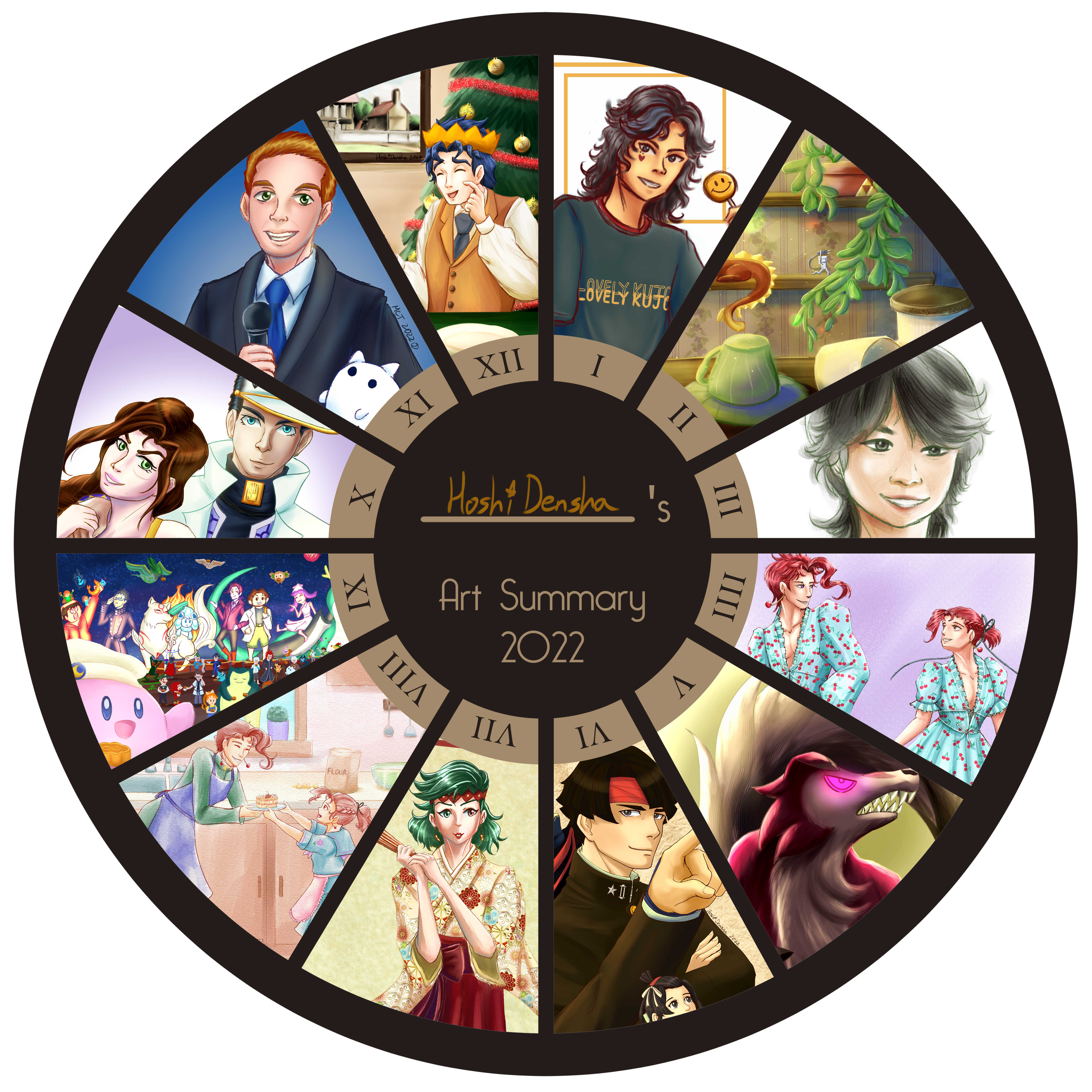 Happy New Year!! I'll start off by posting my art summary for 2022 because I forgot to post it before the year ended lol (Featuring a clock template made by [Taxkha](https://twitter.com/Taxkha/status/1599783017102254080?s=20&t=a3Iz5SyOnzokDIZ2kpkSdQ) on Twitter, as a shout-out to the Jojo Chronology zine I participated in last year!)