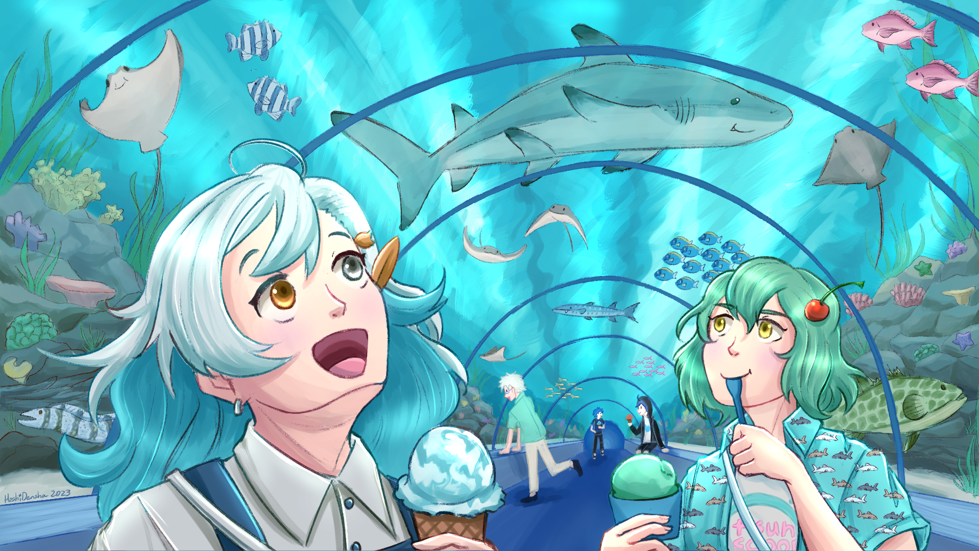 My entry for the [Tsunscoops x Umvvelt Art Contest](https://tsunscoopsxumvvelt.carrd.co/)!! Here’s Ryuki and the gang exploring a shark tunnel~ (OCs belong to Umvvelt and Tsunscoops)