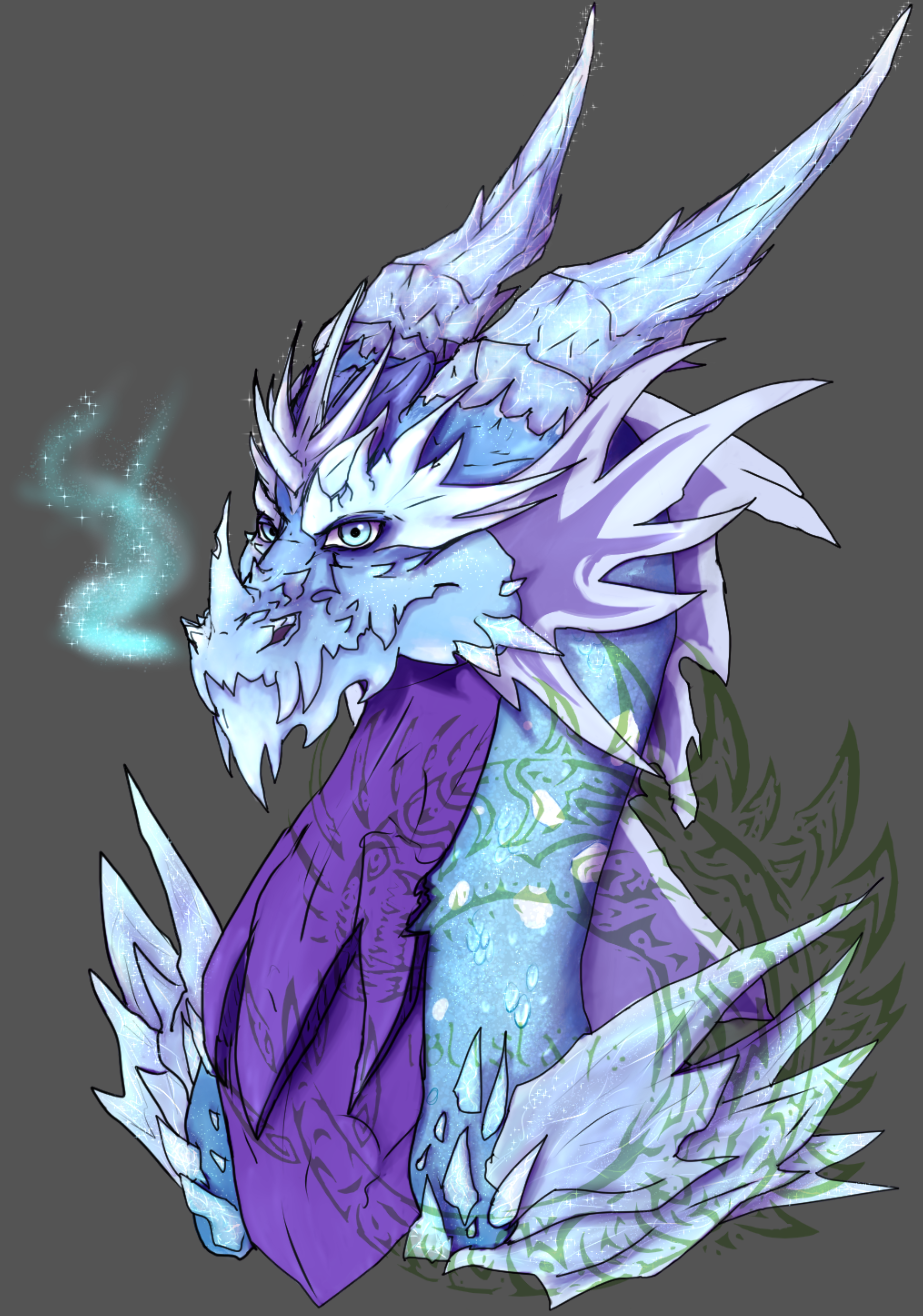 Cyril is much older since 20 years had past in this AU/timeline I been working on. Is he still Ice Guardian? Nah, he's a royally old man. He's ice is stronger despite his age. Entering his Elder title and late stages in life. Ice spikes had started to sprout out of his body and face. His lines are more jagged, his horns are encased in ice. His scales shimmer more due to a thin layer of frost coats his entire body. At the same time his colors are becoming paler. Which means he's working with the new Ice Guardian and of course...as Cyril does. Be positively snobbish..but he has toned it down after sometime had passed. kinda.