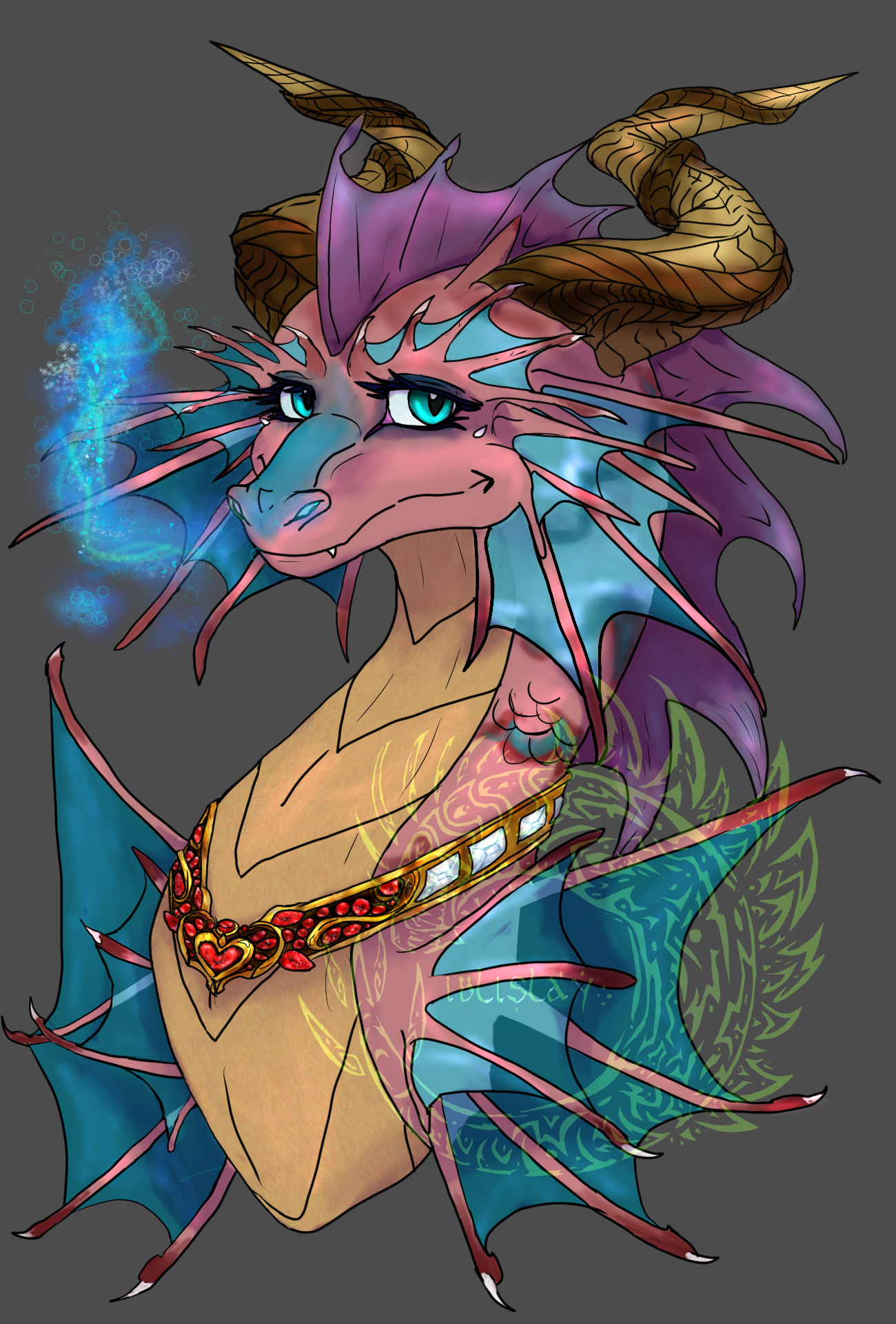 Instead of a fire dragon. I made her a water element. something different ya know? Extremely smart, and social. Talkative and precise. She and Volteer are a devastating duo when it comes to conversing. Cyril tends to stay away from them when they talk.