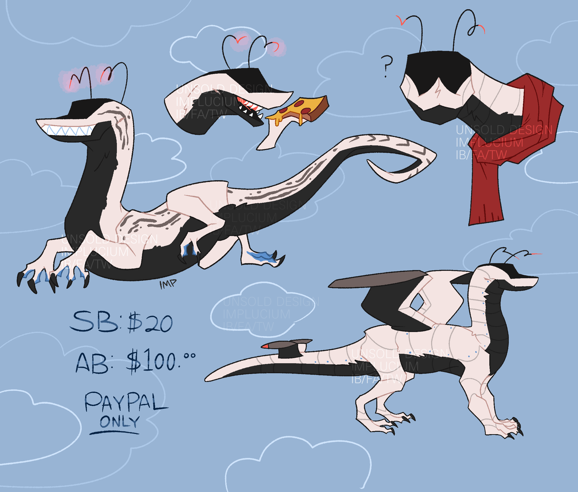 Comments appreciated and likes! You don't have to bid to support me, your love is enough!! I rarely ever put my art for sale anymore so please support me! Even compliments or nice comments is good.CLAIMED BY RUHO ON TOYHOU.SE ------ Eeee a funny plane fella I have been wanting to make for AGES. Some design notes: - The main body and plane form are 2 separate forms, body can be segmented like metal plating on either design. - Antennae blink red light. - The visor is attached to the face, but glowing red eyes can appear on it for expressions.. ** AUCTION RULES ** **DO NOT BID HERE! INKBLOT COMMENTS MAY NOT LOAD, INSTEAD BID ON THE FA OR TH SUBMISSIONS:**____ https://www.furaffinity.net/view/51860814#cid:171997255, https://toyhou.se/21199132.flying-high-auction-desc ------ Starting Bid: $20 USD MI: N/A (Just try to go over $3 each bid) AB: $100 USD, will include a Toyhou.se icon (examples in my gallery) - I can change some things about the design such as adding markings or some colors. - Toyhou.se is not required, all files will be emailed through google drive. - Comes with a transparent reference w/o background. - Please only bid if interested, you can do whatever you want with the design but I would prefer if someone purchased because they appreciate my work! - Please no backing out! This is currently my food and rent. Thank yall. : > check my page for other creature stuff ------ Other notes: Yes the AB is high but that's for a reason. I don't intend on anyone ever ABing. The design is a bit bland however a lot of time went into the design of the reference, colors can be changed as I saved the MDP. ------ Comments appreciated and likes! You don't have to bid to support me, your love is enough!! I rarely ever put my art for sale anymore so please support me! Even compliments or nice comments is good.0 Comments 0 Shares 34 Views -