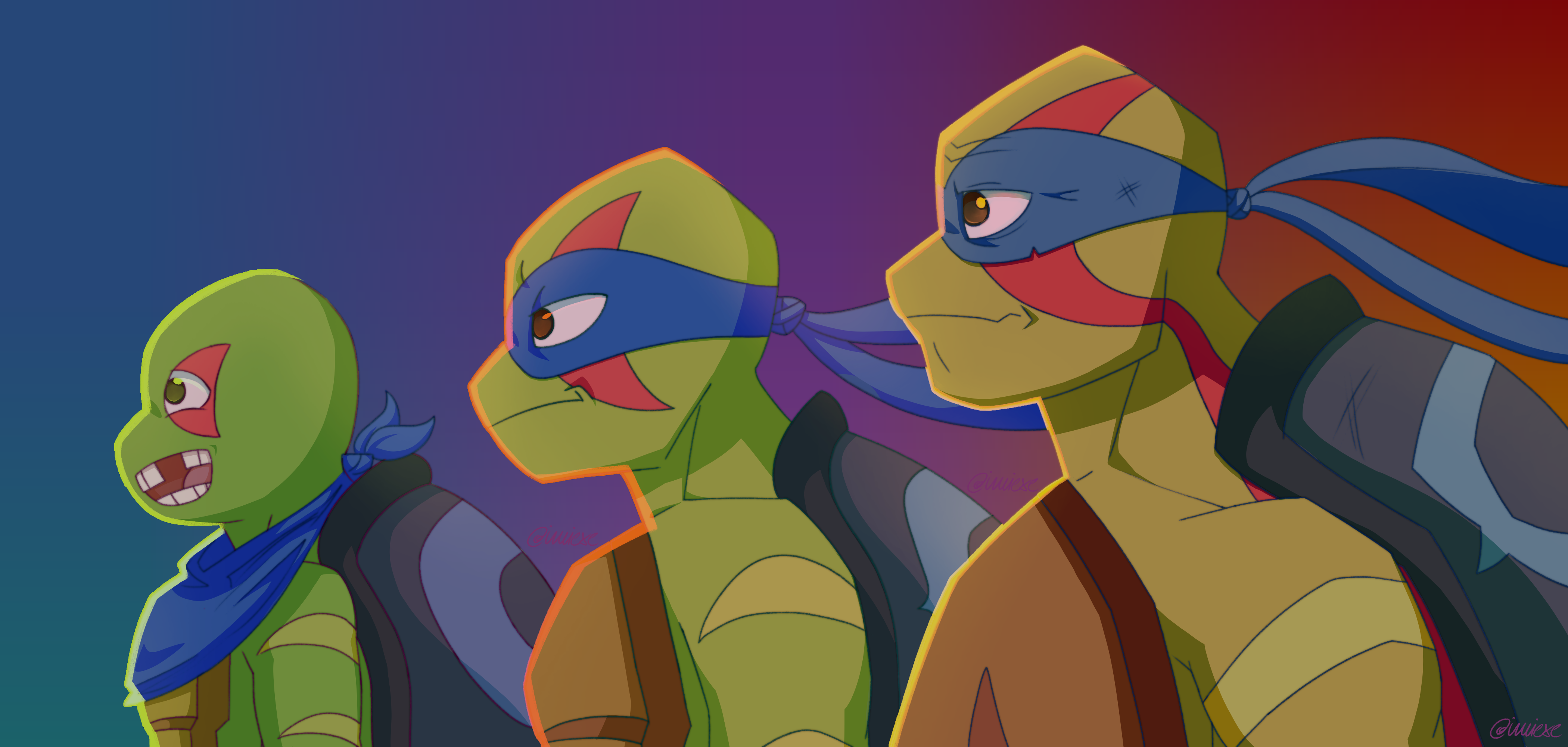 and last, is 40 year old Leonardo from the Kraang Apocalypse timeline. he is barely in his 40s, looks older than that, wonder why that is. he looks much more angular but also sturdy now, and is much stronger. the red markings are even longer, their top parts meeting in the middle of his head, bottom parts connecting to the jaw and then going down his sides. shell is scratched in many places, the markings on it now are all angular and sharp, there's nothing soft about them. his personality hasn't changed much though, he is still the same constantly-joking Leo, just now he has more responsibilities, and after Splinter's passing, has to be the head of both his family, and the resistance, he's now a pillar of strength for everyone around him. he needs a break tbhi just wanted to show him at certain stages in his life. left to right, there's the 5 year old Leon. he is the greenest he will ever be, and his red markings are short and stubby, just as the baby turtle himself. the blue markings on his shell are looking like donuts at this moment, there are no spiky edges to them. they're just squarish looking circles. this leo, he prefers wearing his bandana on his neck. very adventurous and outspoken little guy, and so very troublesome for his poor single dad. second is 16 year old Leo, fresh after the Kraang invasion. his red markings have gotten longer by now, his scales have gotten a bit more yellowish, but he's still very green. his personality doesn't need introduction, the only thing that's different is maybe that now he's more humble, after the Kraang incident in which, well, he almost sacrificed himself for the world. and last, is 40 year old Leonardo from the Kraang Apocalypse timeline. he is barely in his 40s, looks older than that, wonder why that is. he looks much more angular but also sturdy now, and is much stronger. the red markings are even longer, their top parts meeting in the middle of his head, bottom parts connecting to the jaw and then going down his sides. shell is scratched in many places, the markings on it now are all angular and sharp, there's nothing soft about them. his personality hasn't changed much though, he is still the same constantly-joking Leo, just now he has more responsibilities, and after Splinter's passing, has to be the head of both his family, and the resistance, he's now a pillar of strength for everyone around him. he needs a break tbh0 Comments 0 Shares 2 Views -